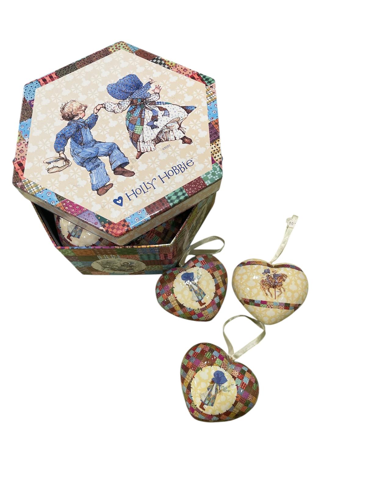 Elegante set decorativo in stile vintage Holly Hobbie, composto da una raffinata scatola esagonale con illustrazioni romantiche e 12 palline a forma di cuore coordinate, ideali come decorazione da appendere.