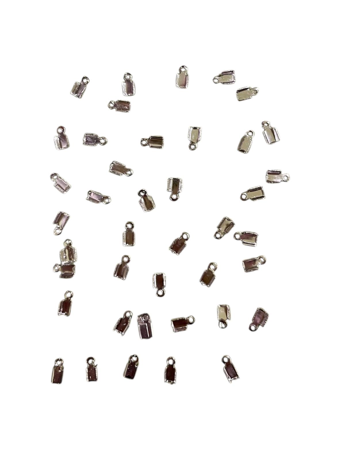 Chiusure fermacorda in metallo color argento, ideali per rifinire con eleganza nastri, cordoncini e fili decorativi.
