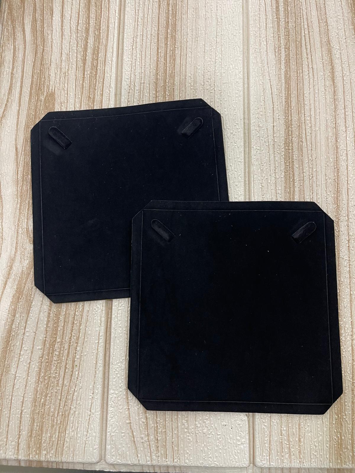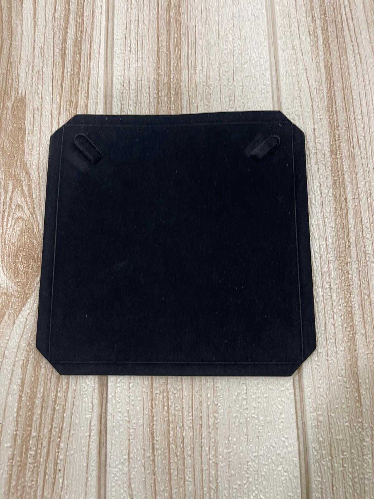 Base espositiva rettangolare rivestita in velluto nero, ideale per valorizzare gioielli come anelli, bracciali, collane o orecchini.