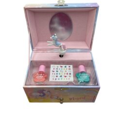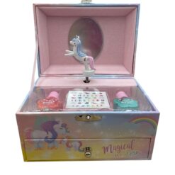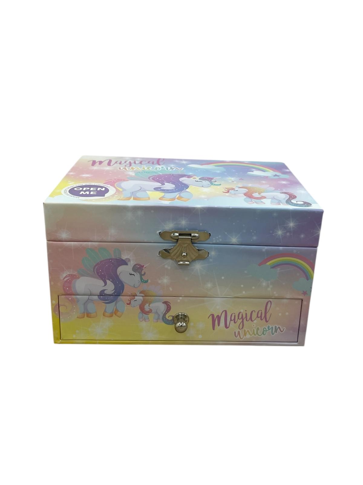 Il Cofanetto Portagioie Unicorni è decorato con unicorni e arcobaleni, e alzando il coperchio si attiva il carillon classico, con un grazioso unicorno che gira sul bordo accompagnato da una dolce melodia. All’apertura, un piccolo specchio rende l’esperienza ancora più speciale.