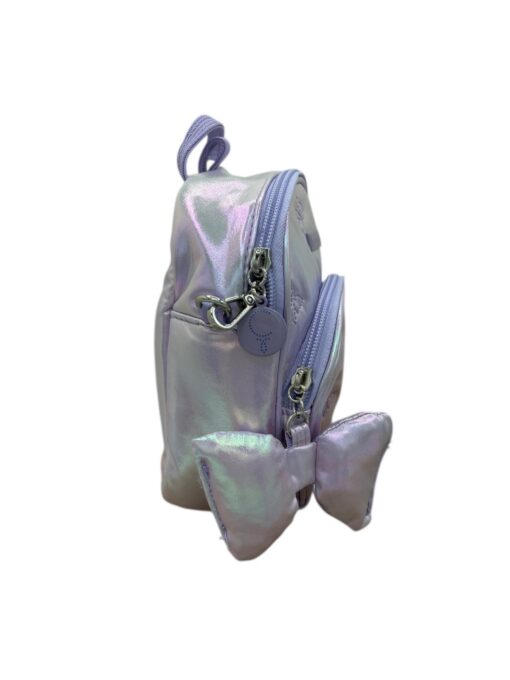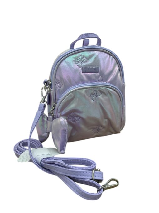 Questa deliziosa borsettina a forma di zaino con tracollina è realizzata in materiale morbido e leggermente olografico, dal colore lilla brillante, perfetta per le piccole fashioniste che vogliono portare con sé lo stile anche nei dettagli più piccoli.