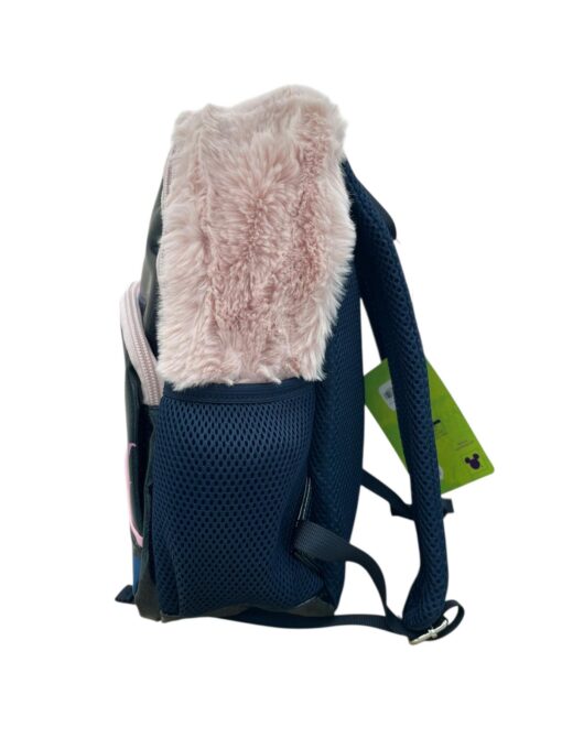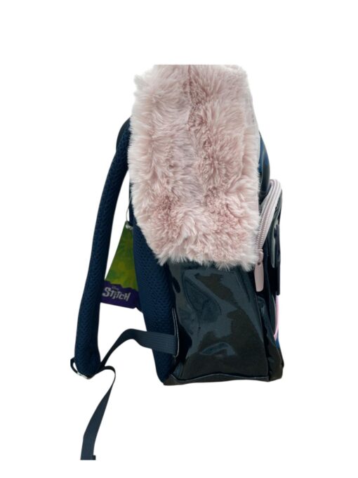 Il colore blu notte con glitter azzurri dona un tocco luminoso e stellato, mentre il profilo è avvolto da un morbido bordo effetto peluche rosa, che rende lo zaino ancora più speciale e accattivante.