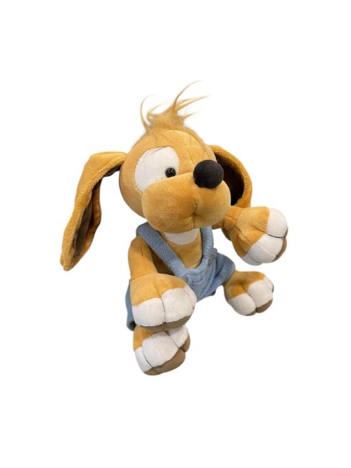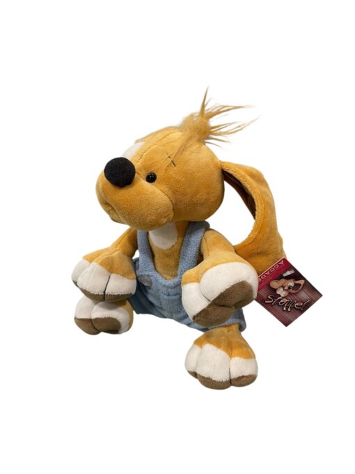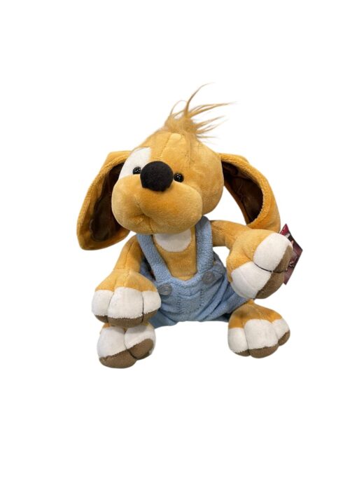 Morbido cagnolino in peluche che indossa una graziosa salopette.