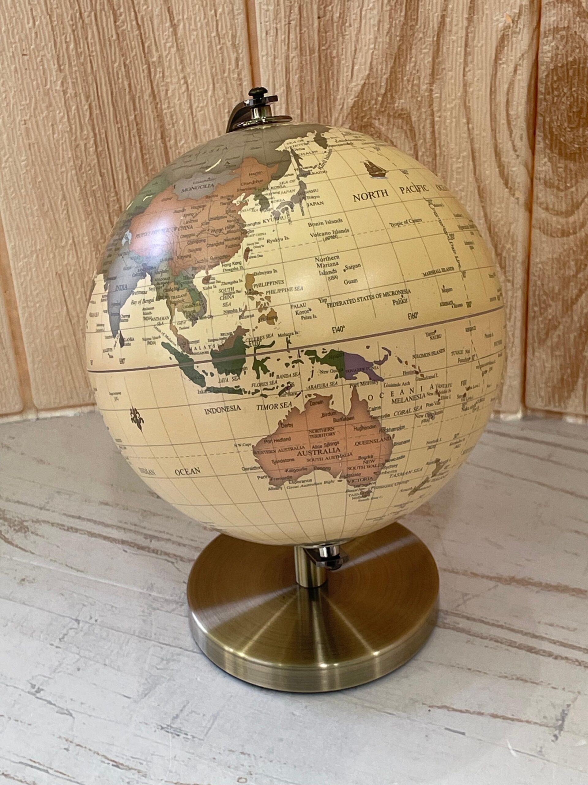 Mappamondo decorativo dal gusto classico e raffinato, con piedistallo dorato e globo beige ispirato alla cartografia d’epoca.