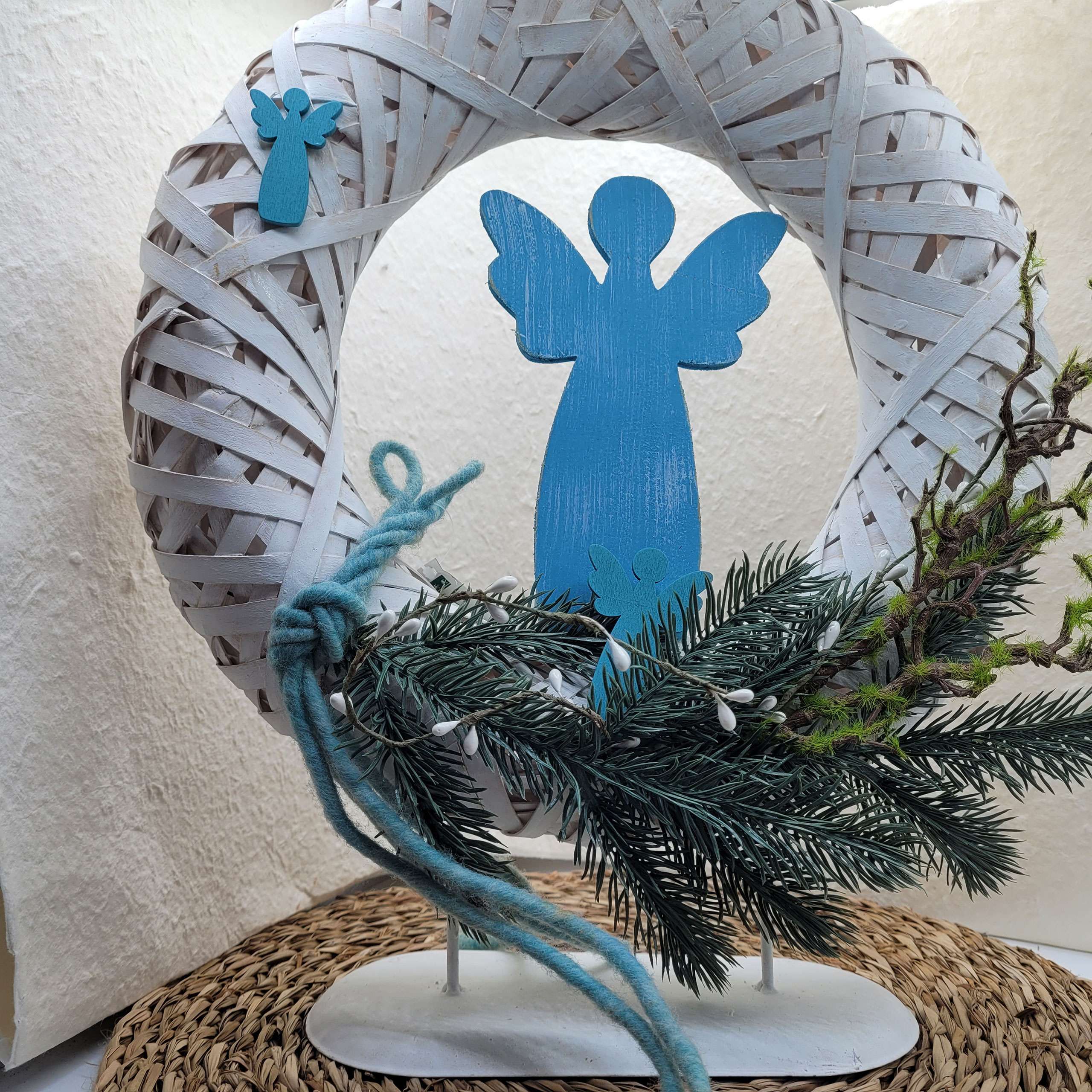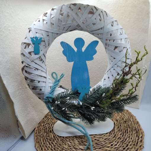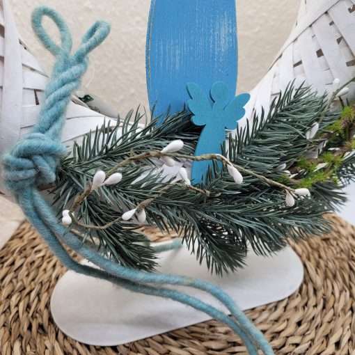 Addobbo natalizio da appoggio, formato da un cerchio con al centro un angelo azzurro in legno.
