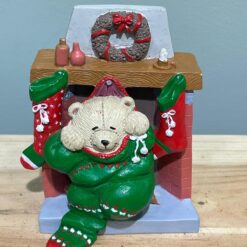 Deliziosa scena invernale con orsetto all’interno di una calza appesa al camino. Trasmette allegria e spirito natalizio.