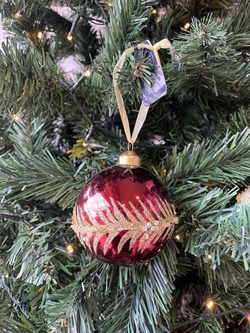 Set da 3 palline di colore bordeaux con glitter oro che formano una foglia.