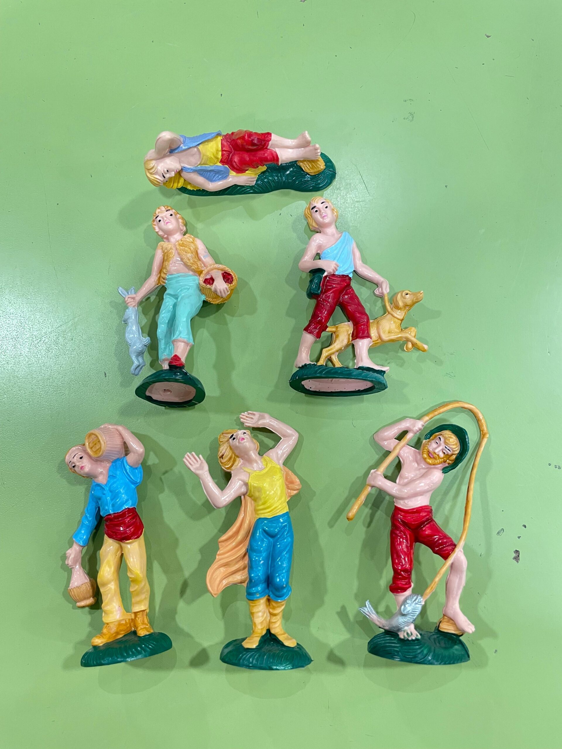 Set da 6 pastori assortiti per presepe in resina colori forti.