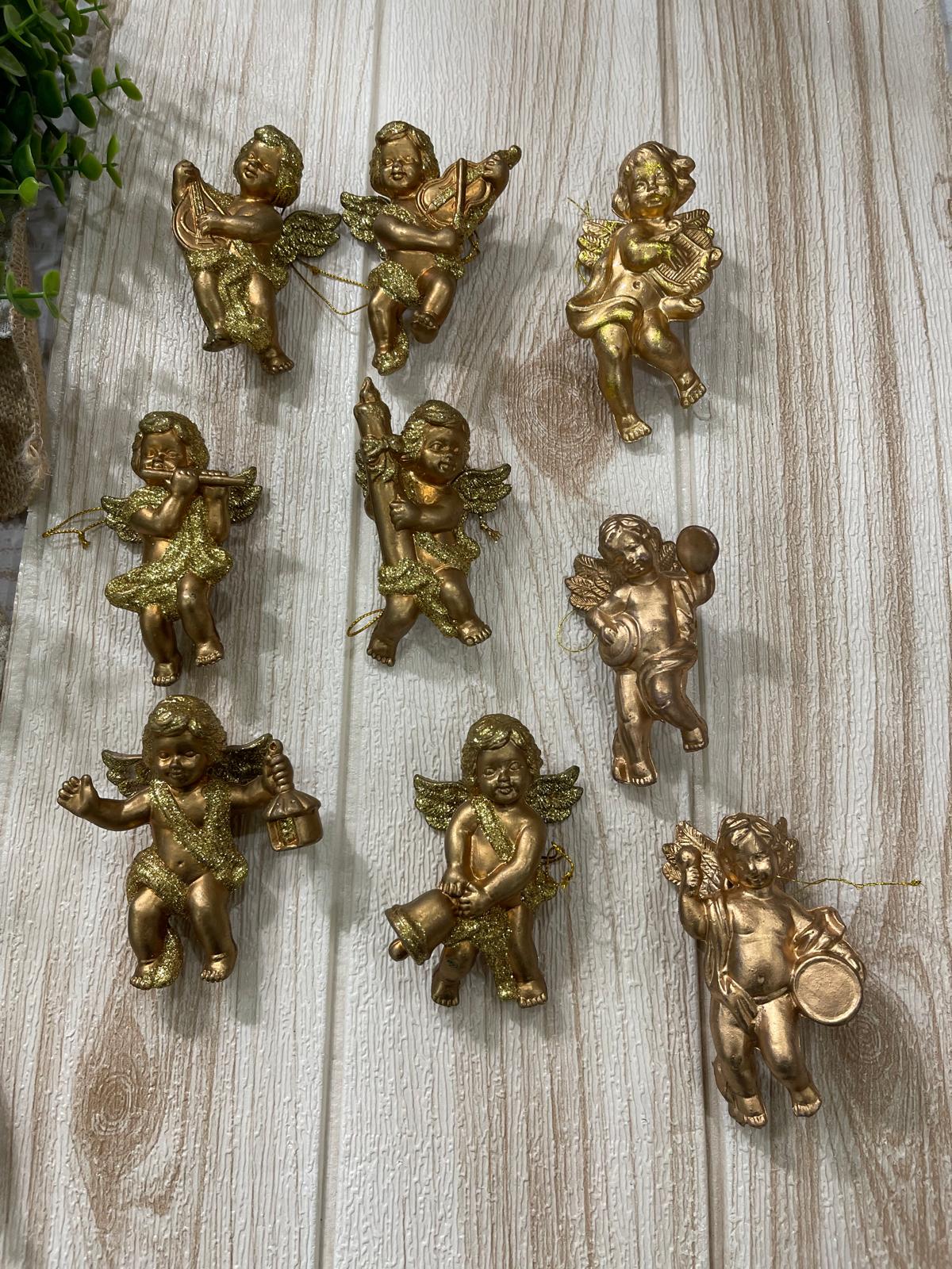 Angeli color Oro, ognuno con in mano uno strumento musicale diverso, impreziosito da glitter scintillanti.