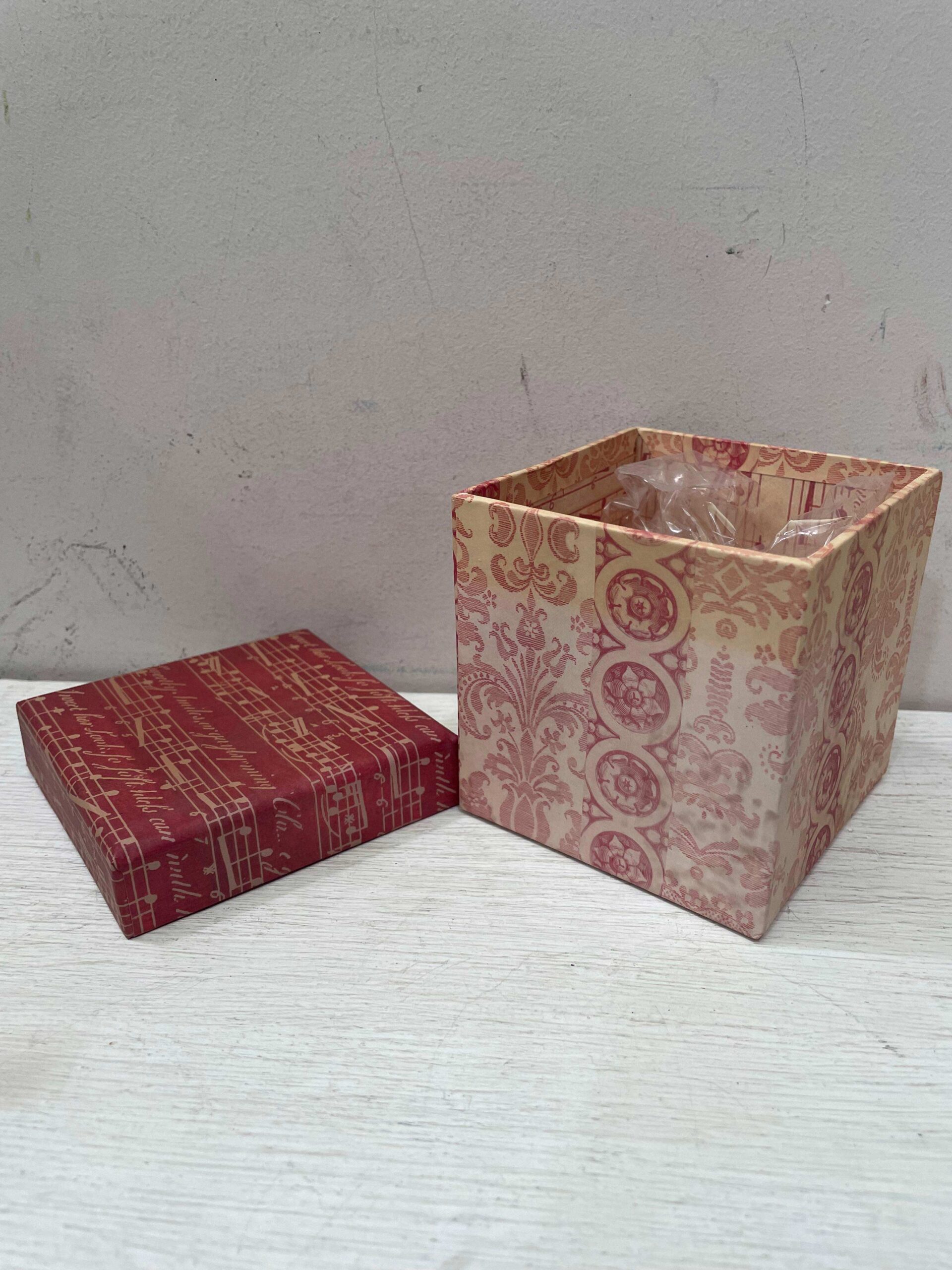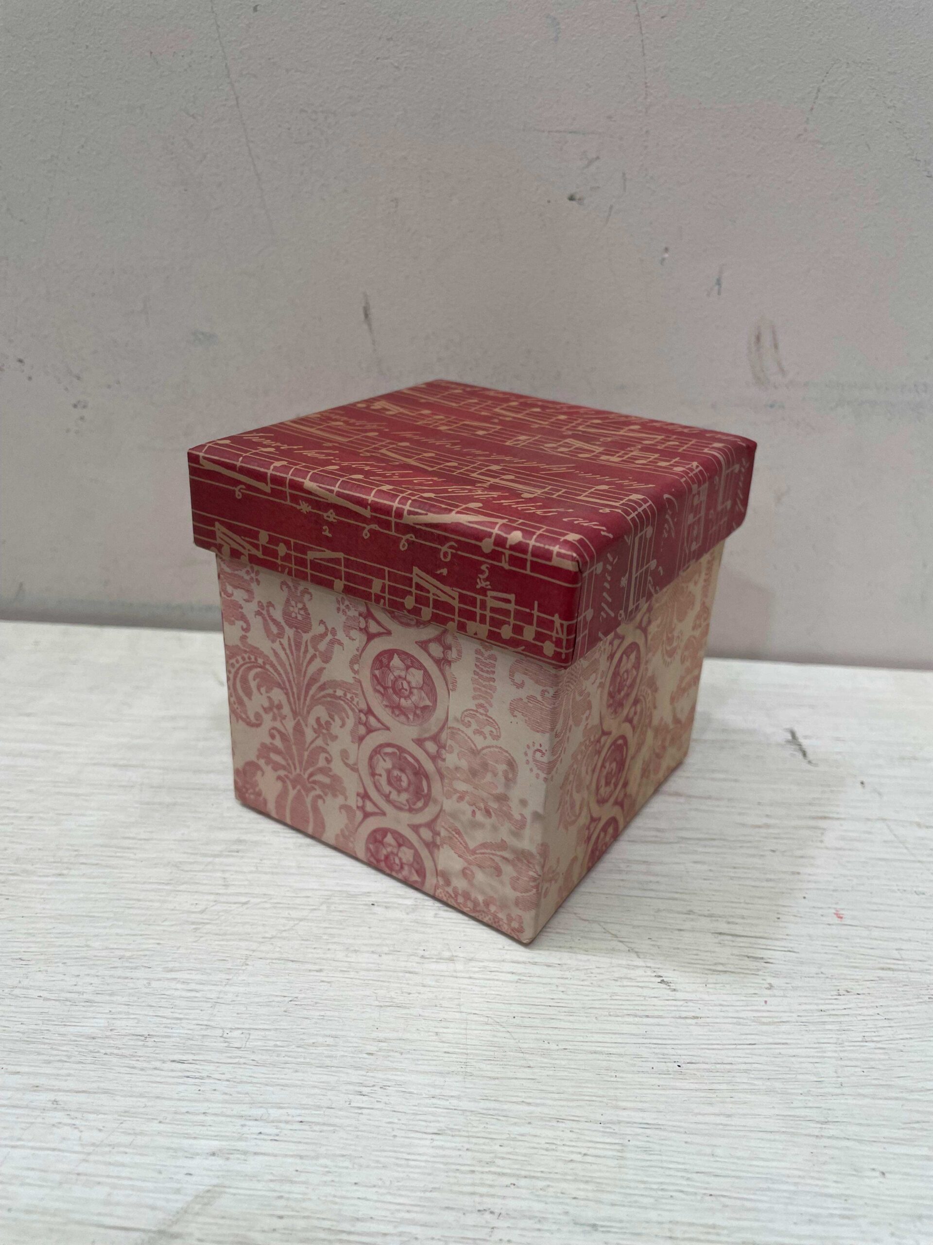 Piccola scatola regalo sui toni del rosso decorata con note musicali.