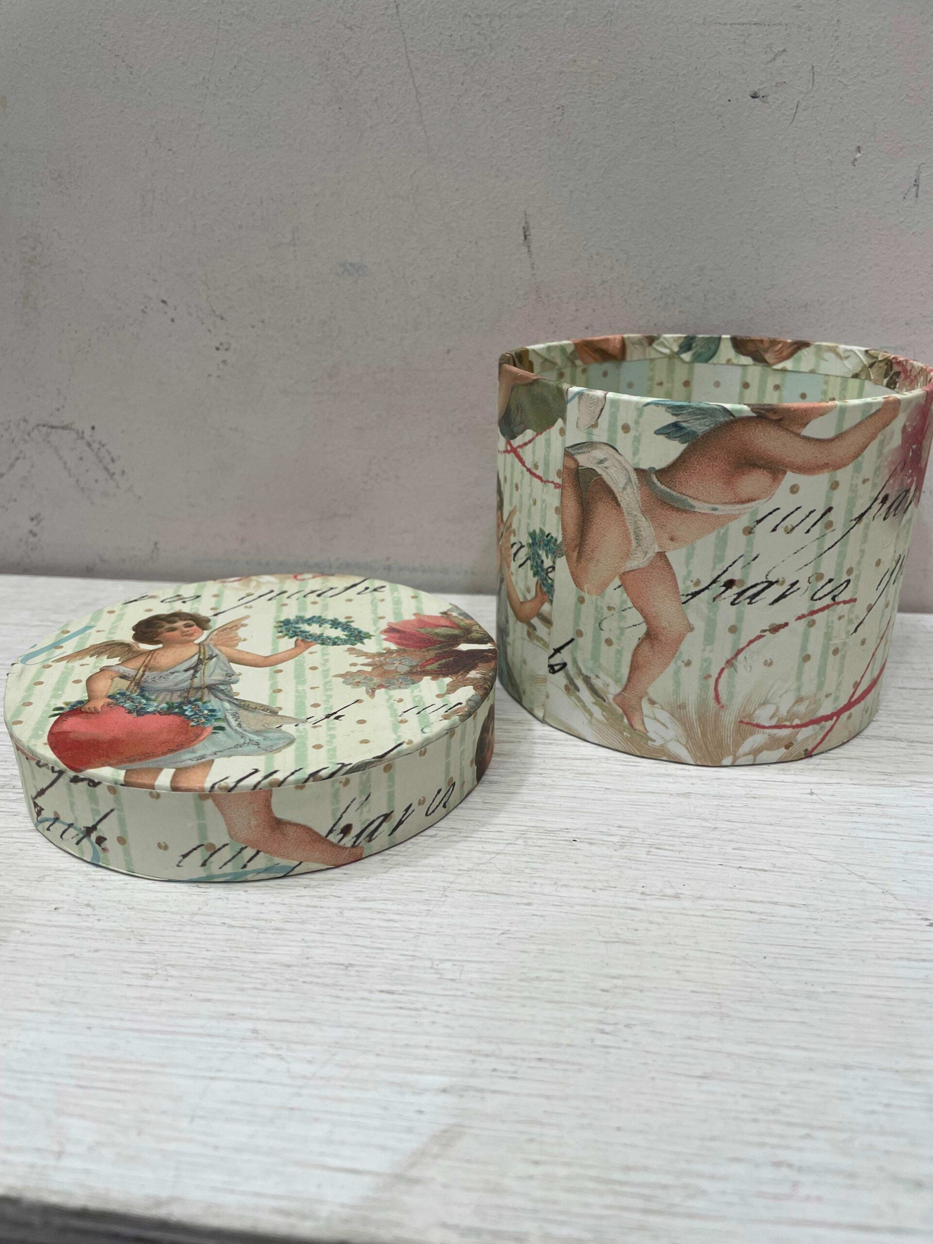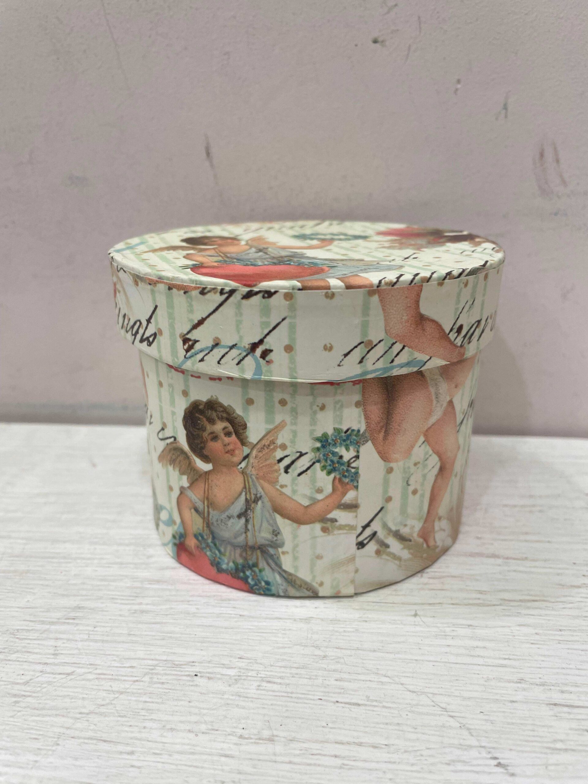 Piccola scatola regalo tonda Ø 9 decorata con dei graziosi angeli.