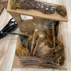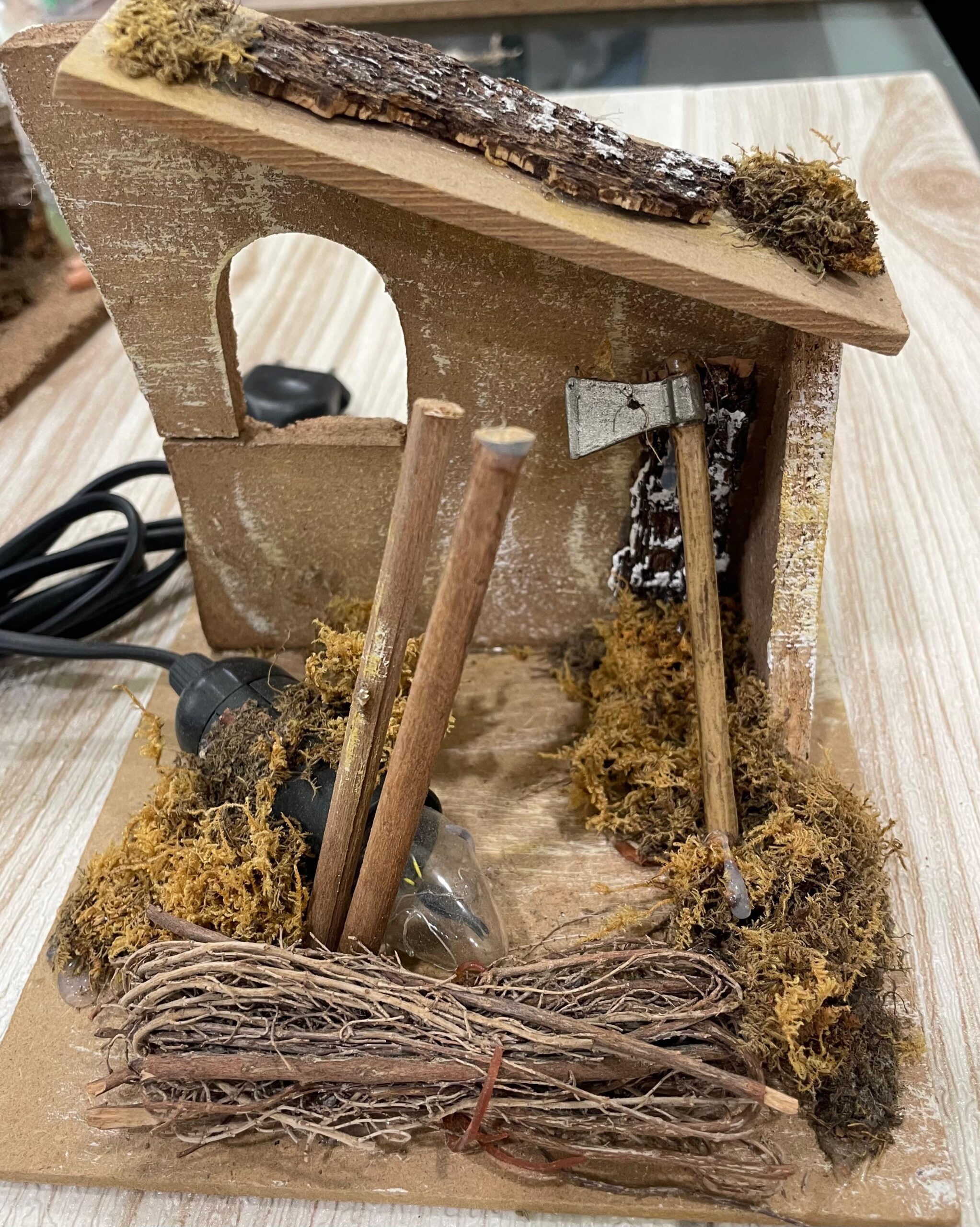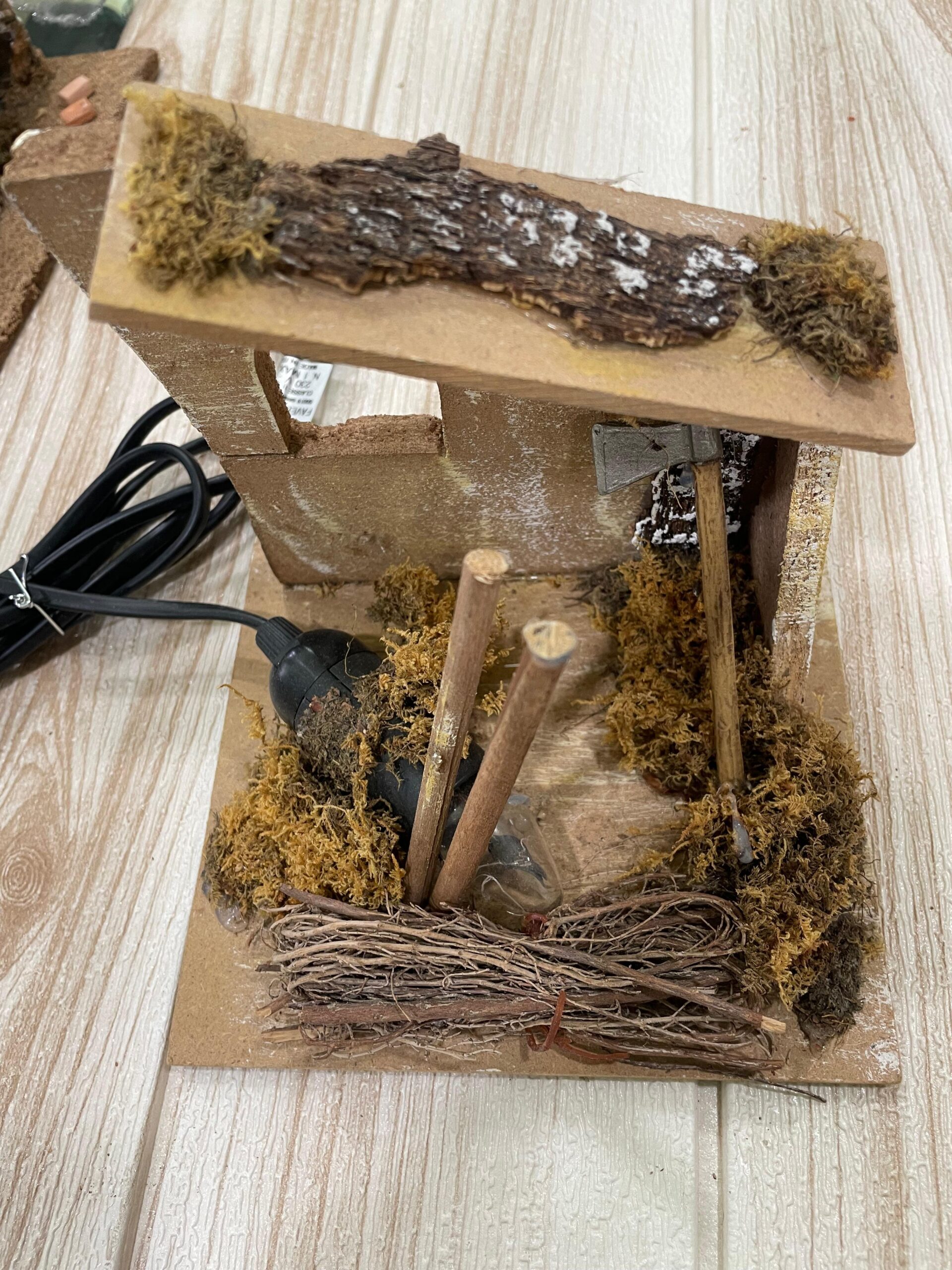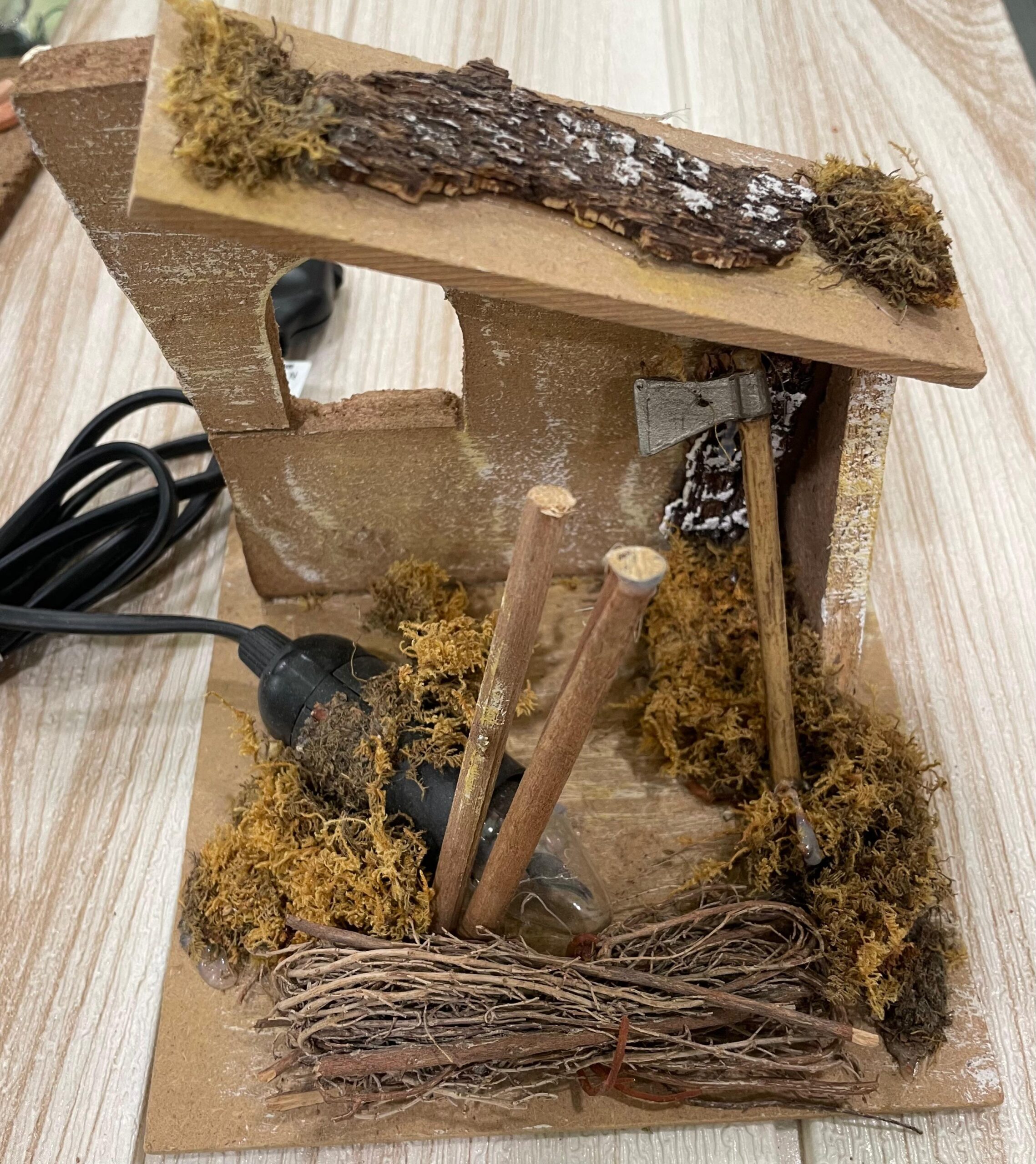 Ambientazione per presepe effetto fuoco realizzato con lampadina alimentata da cavo per corrente elettrica e una finestra