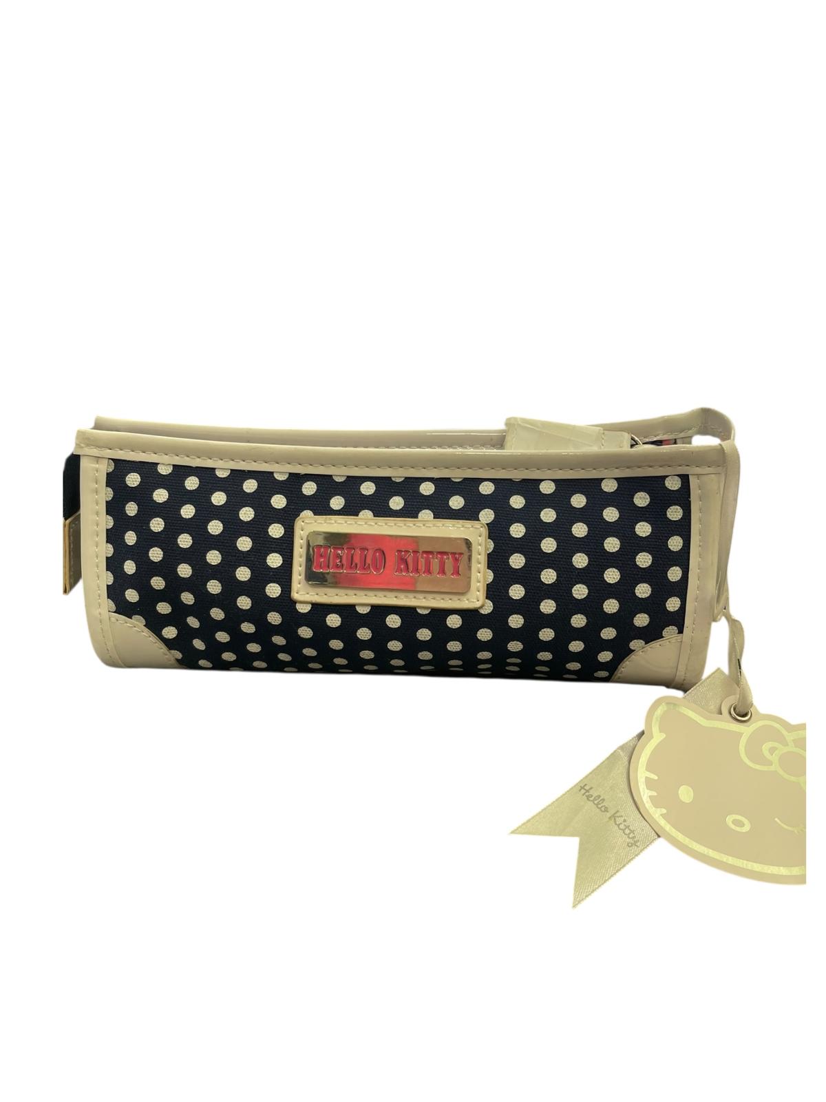 Astuccio Bustina Hello Kitty in tessuto blu e pois bianchi con rifinitura lucida bianca, sul fronte troviamo la stampa del personaggio con un carinissimo fiocco rosa e sul retro una targhetta in metallo con la scritta del brand.