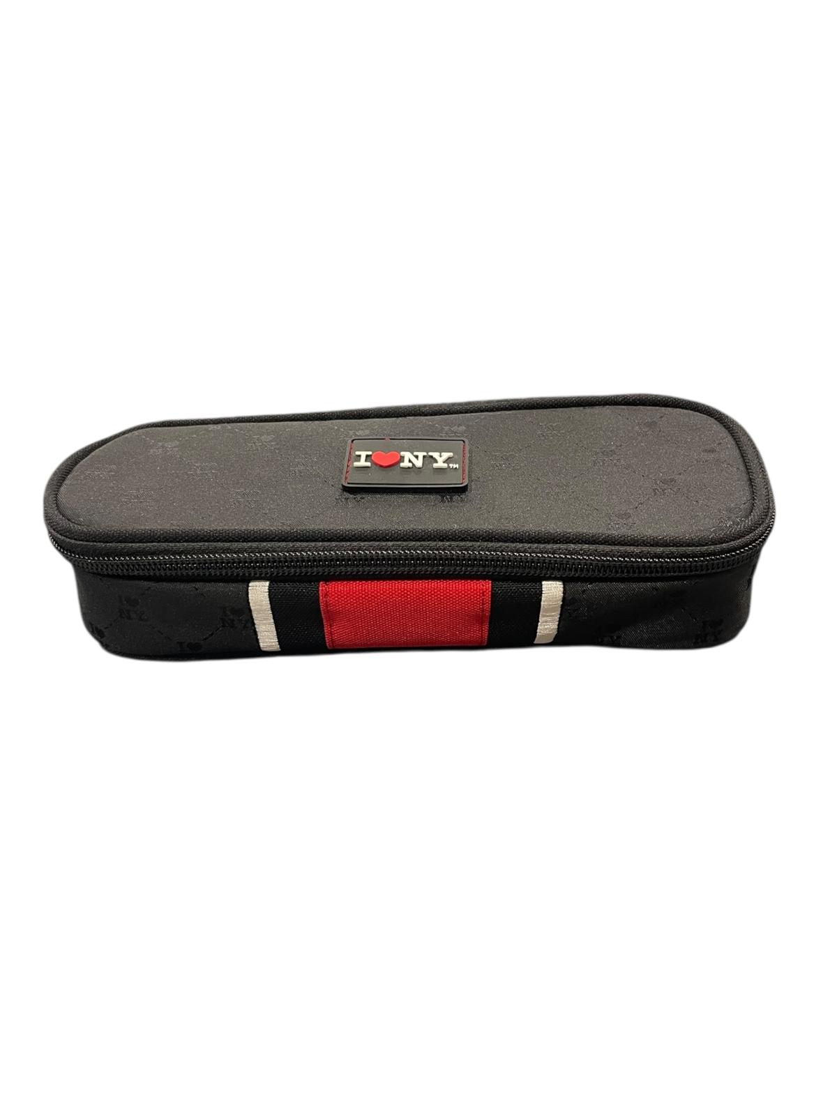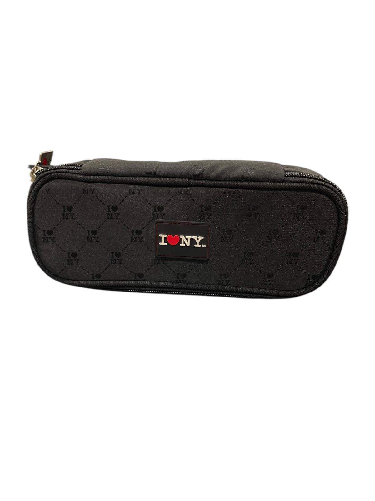 Astuccio ovale I Love New York in tessuto nero unico vano con chiusura zip e tirante metallico quadrato con logo. Rubusto, spazioso e perfetto per la scuola per chi preferisce uno stile moderno e metropolitano.