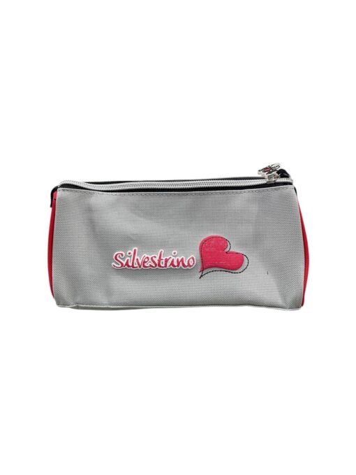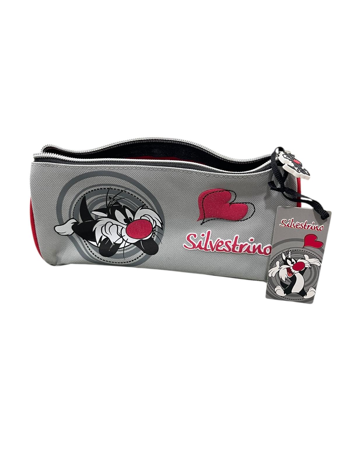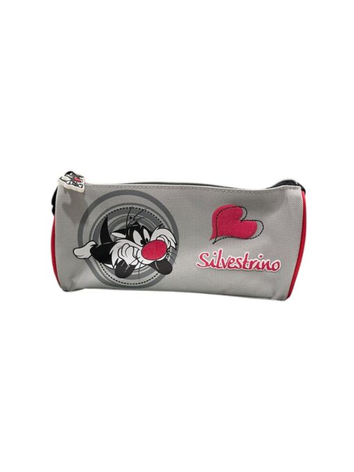 Portapenne capiente con zip argentata e stampa Silvestrino con dettagli glitter.