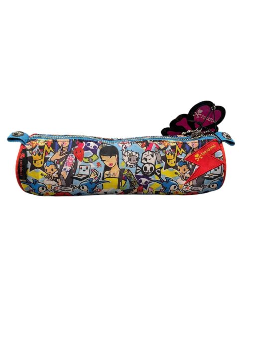 Astuccio Tombolino Tokidoki con chiusura zip e tirante metallico, decorato con i personaggi iconici del celebre brand giapponese e logo tokidoki su patch rossa a forma di fulmine cucito sul laterale, perfetto per scuola e ufficio grazie alla sua forma compatta e pratica.
