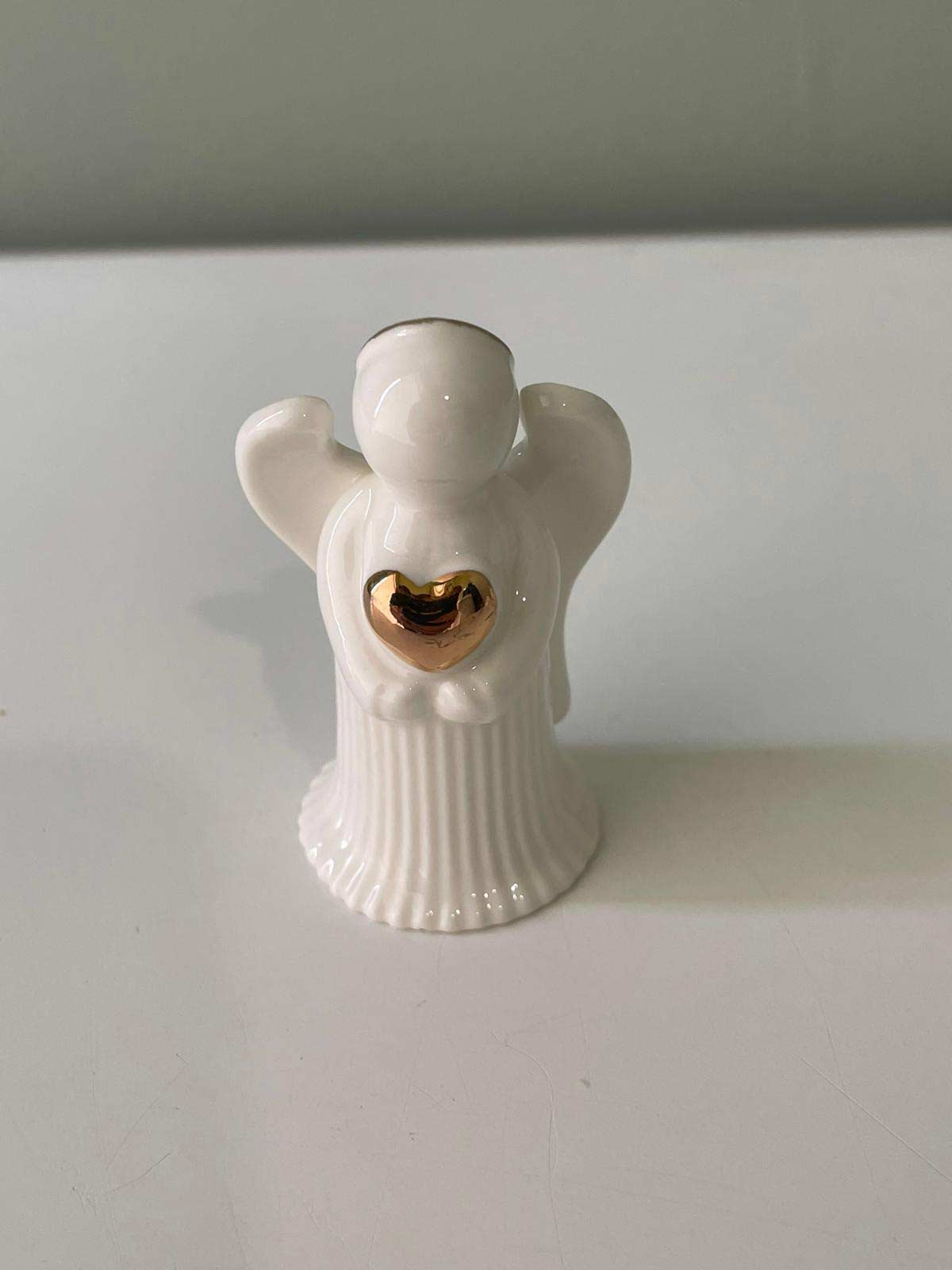 Angelo decorativo in porcellana bianca, dal design stilizzato ed essenziale, impreziosito da un abito plissettato e da delicati dettagli dorati sul cuore e sull’aureola. Le dimensioni compatte rendono questa versione particolarmente delicata e armoniosa, perfetta come piccolo simbolo di protezione e affetto.
