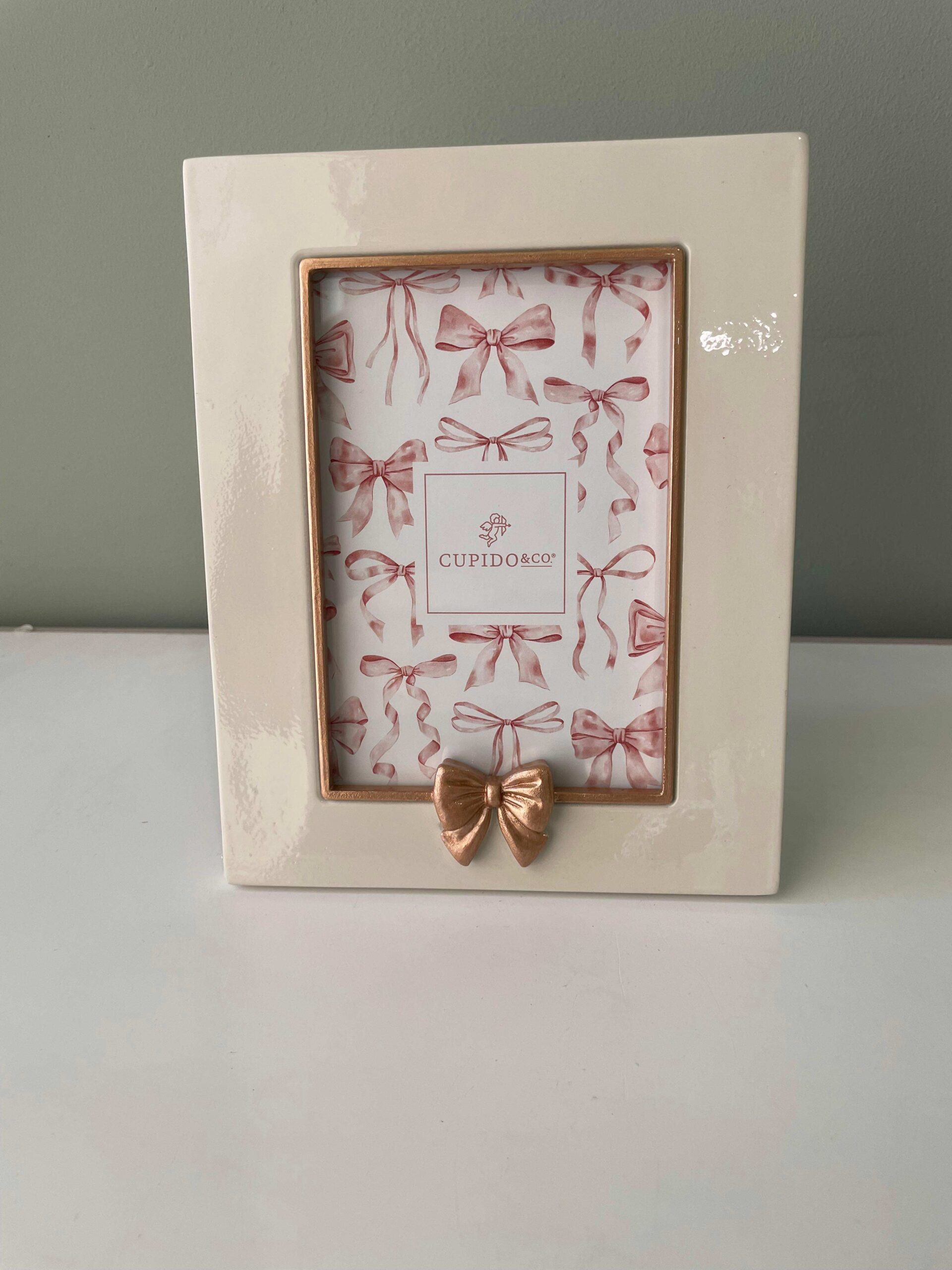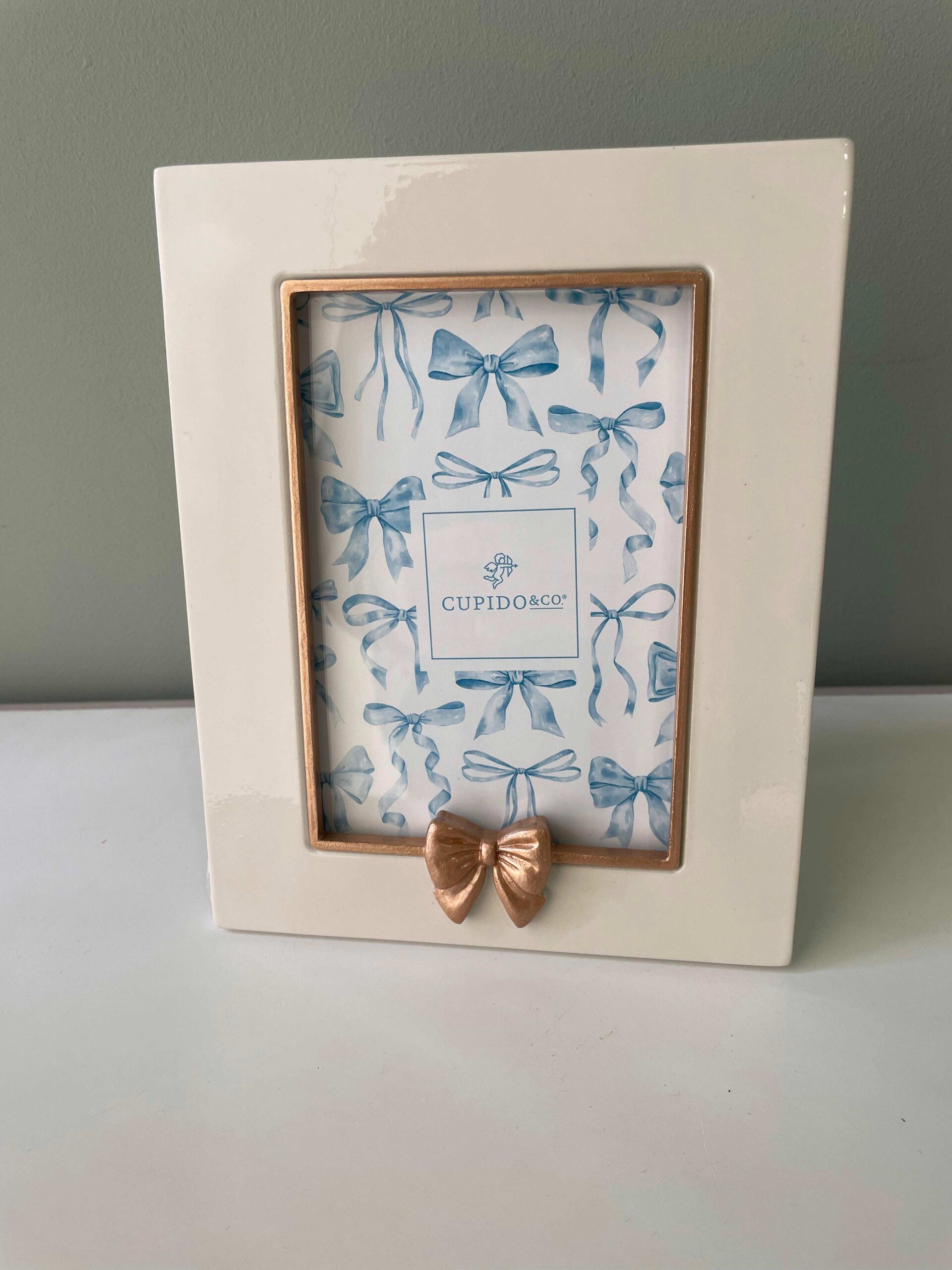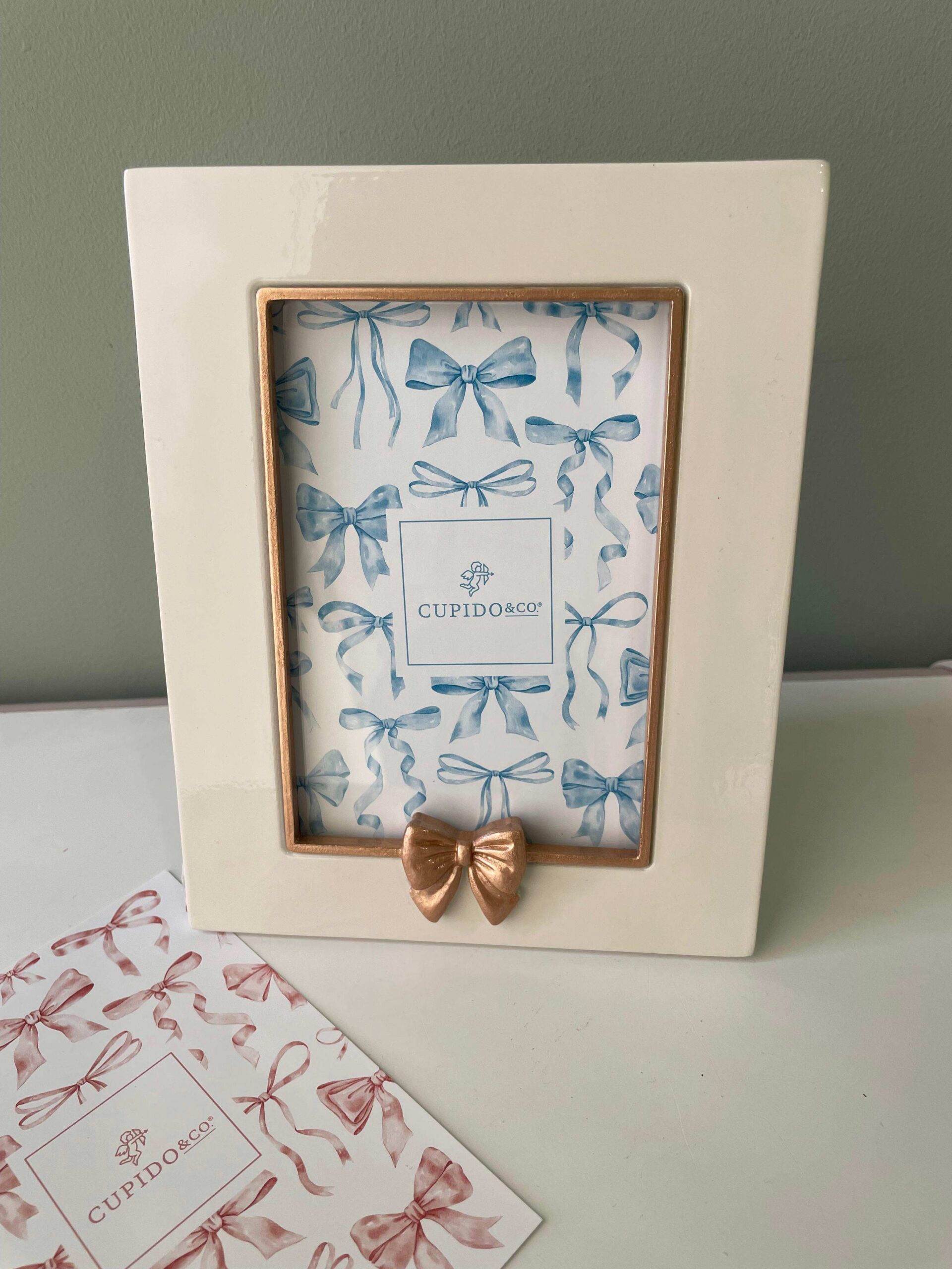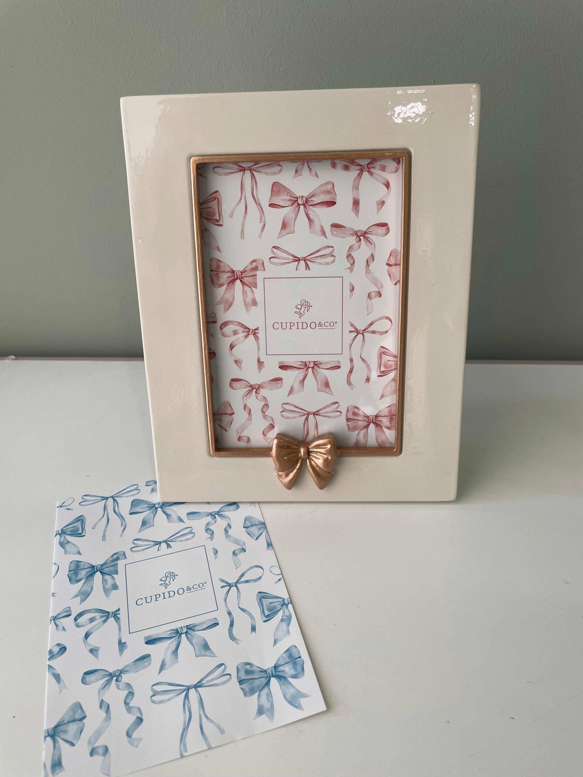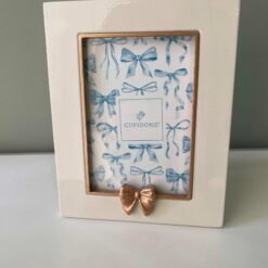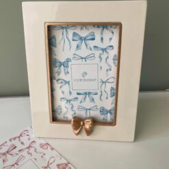 La cornice è arricchita da un luminoso bordo interno dorato, che incornicia lo spazio foto con gusto, e si completa con un dolcissimo fiocco decorativo tridimensionale, curato nei dettagli e protagonista della cornice, elemento che dona un tocco romantico e prezioso.