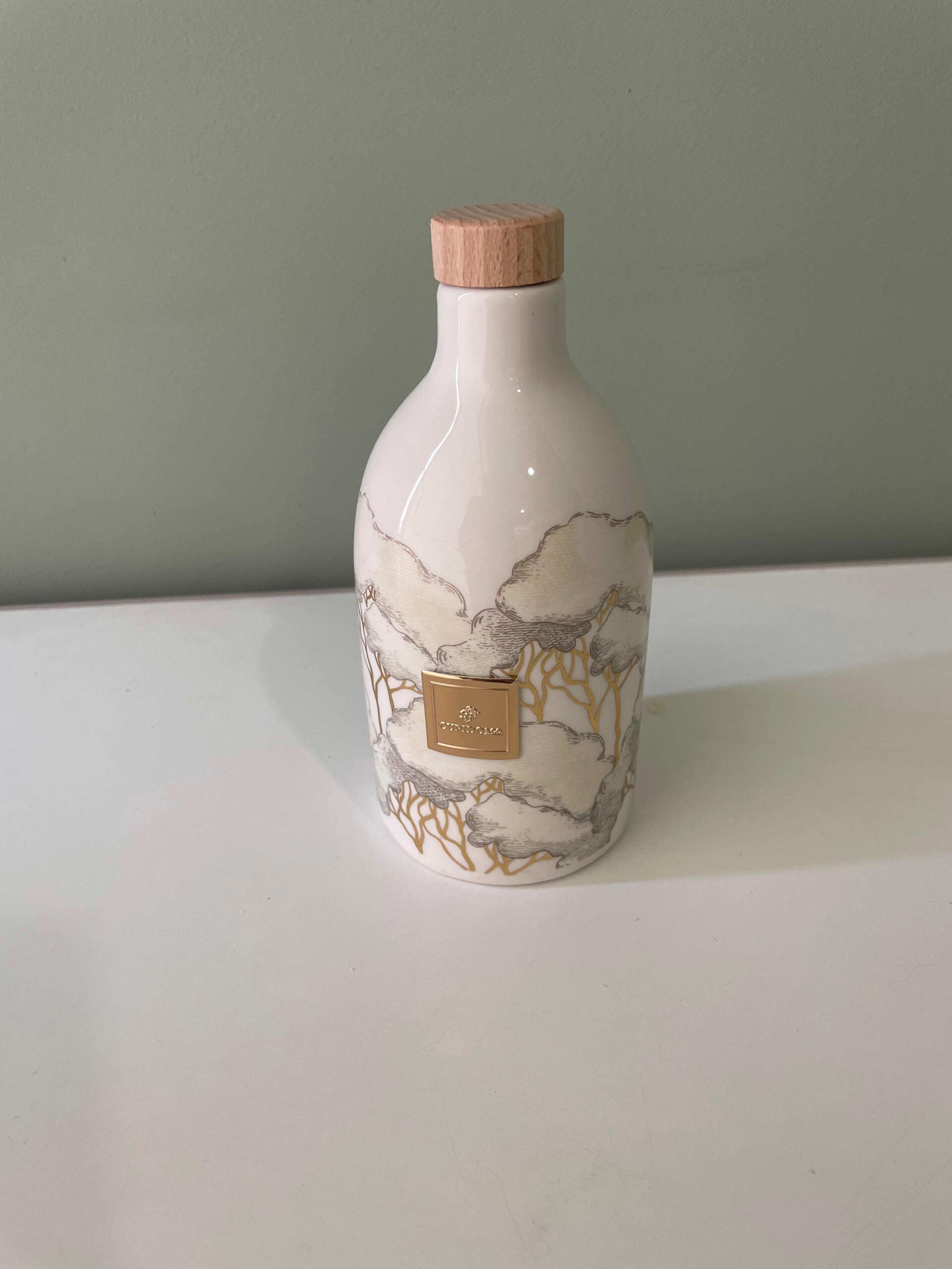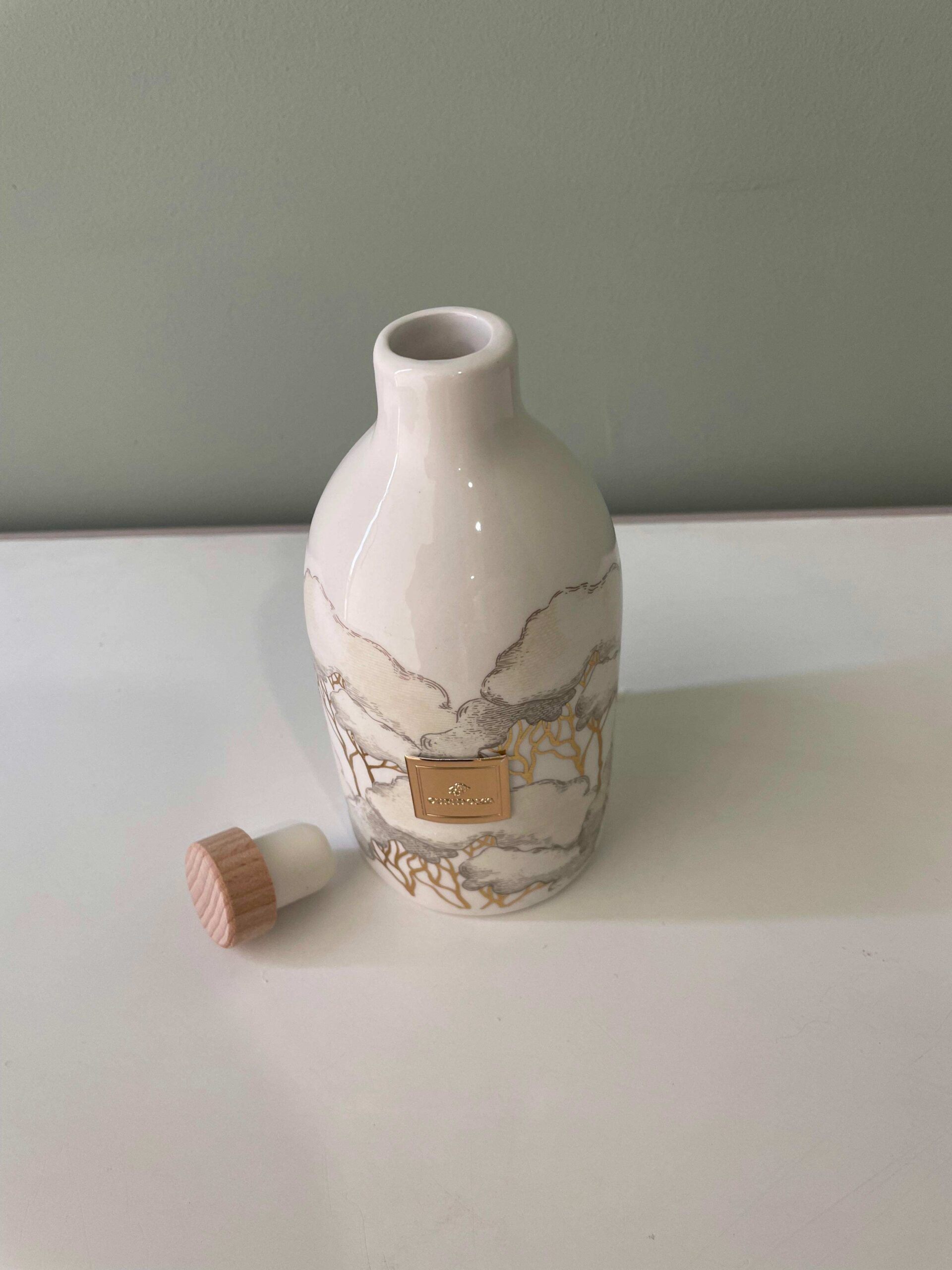 Oliera in vetro color avorio dalla classica forma a bottiglia, appartenente alla raffinata Linea Intrecci di Cupido&Co.. Il corpo è impreziosito da una decorazione ad alberi in stile dipinto, realizzata in tonalità oro, che dona eleganza e luminosità all’oggetto, rendendolo perfetto anche come elemento decorativo per la tavola.