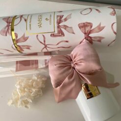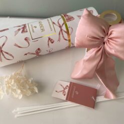 La parte superiore è completata da una bocchetta decorativa pensata per accogliere i bastoncini diffusori, che permettono una diffusione graduale e costante della fragranza. A rendere questo profumatore unico è il morbido fiocco in tessuto color cipria, coordinato e applicabile grazie a un piccolo elastico, per un tocco romantico e delicato.