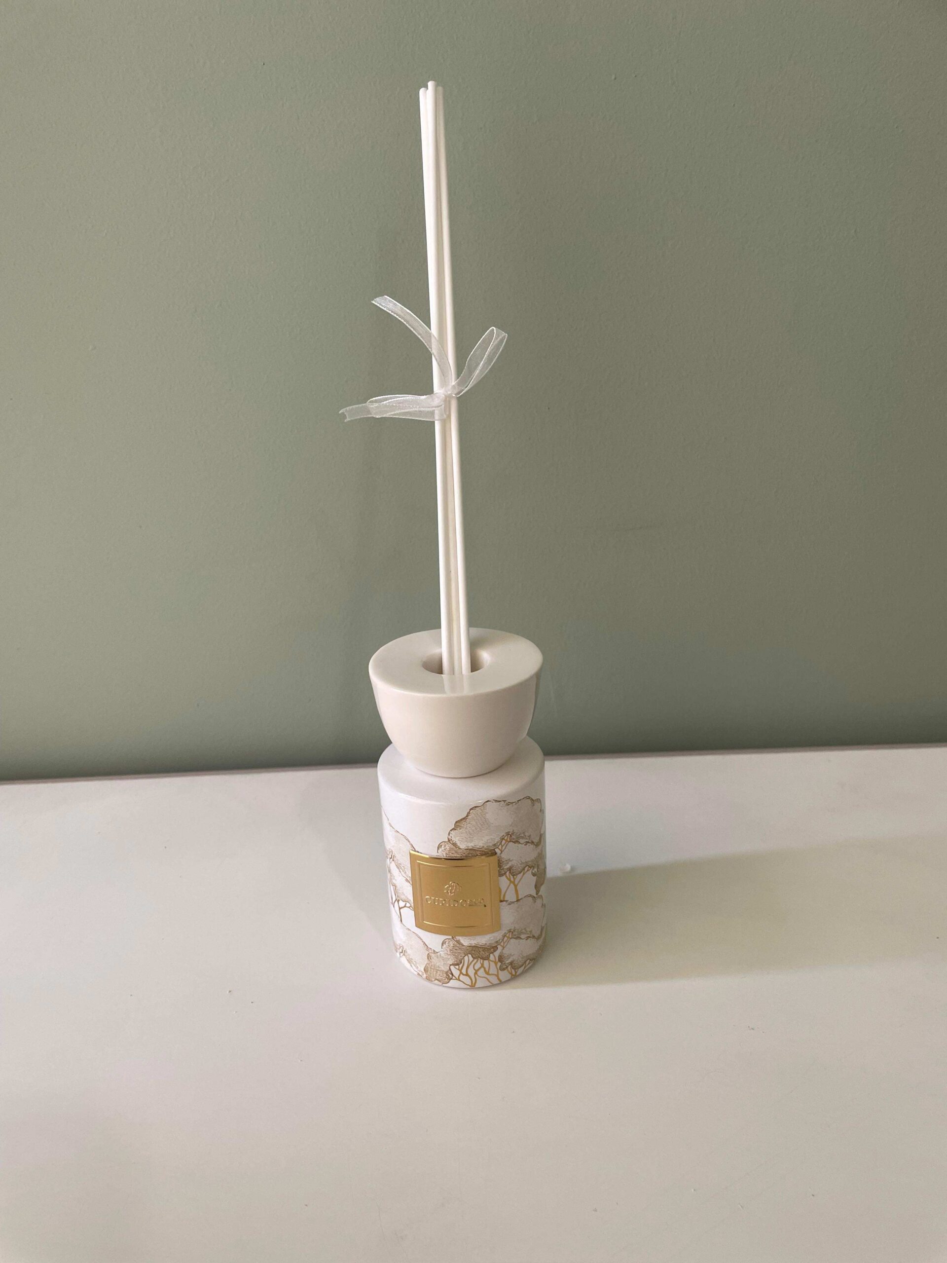 La parte superiore è completata da una bocchetta decorativa, studiata per accogliere i bastoncini diffusori, che permette una diffusione graduale e costante della fragranza. Il profumatore viene fornito già completo di profumo Luxury Amber, una fragranza calda e avvolgente, ideale per creare un’atmosfera elegante e accogliente.