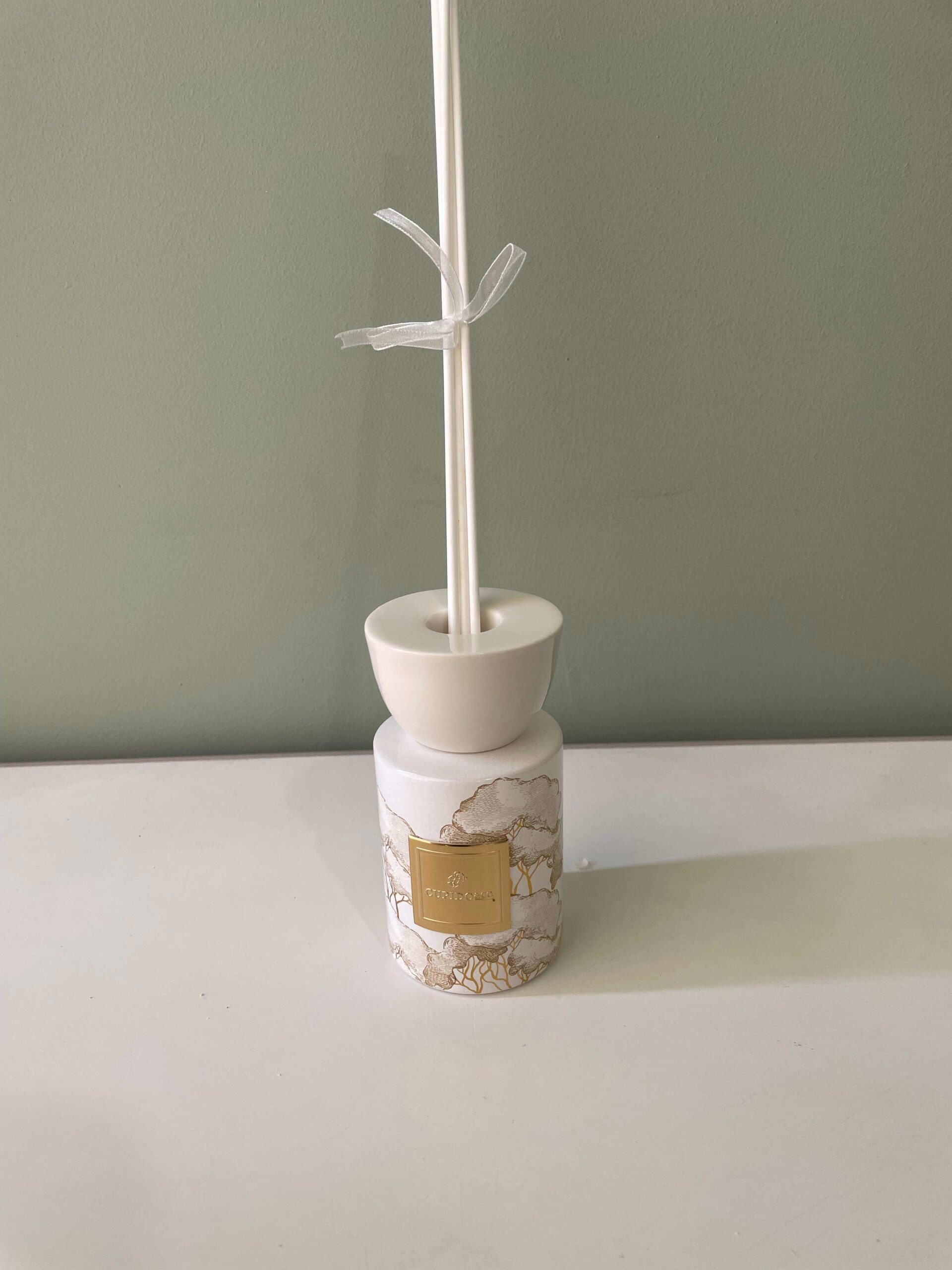 Profumatore per ambienti in vetro color avorio, dalla forma cilindrica elegante e armoniosa, appartenente alla raffinata Linea Intrecci di Cupido&Co.. La superficie è impreziosita da una decorazione ad alberi in stile dipinto, realizzata in tonalità oro, che dona luminosità e un carattere prezioso all’insieme.