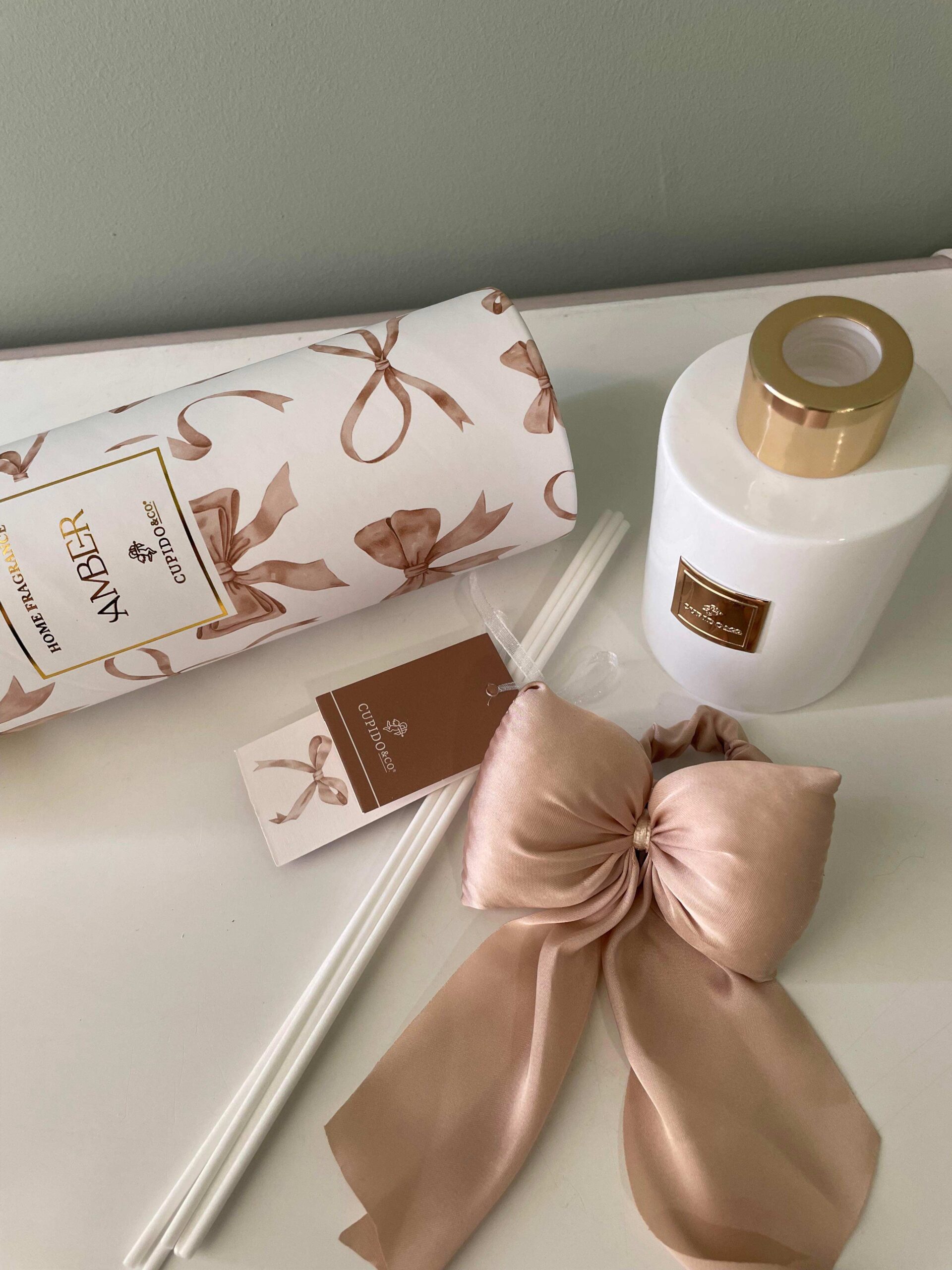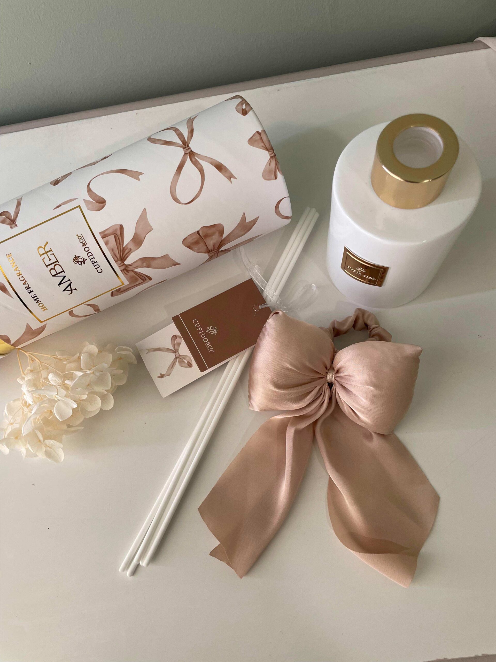 Profumatore per ambienti in vetro bianco dalla forma cilindrica elegante e armoniosa, appartenente alla raffinata Linea Fiocchi di Cupido&Co.. Al centro del flacone è applicata una luminosa targhetta dorata con logo del brand, dettaglio prezioso che dona equilibrio e stile all’insieme.