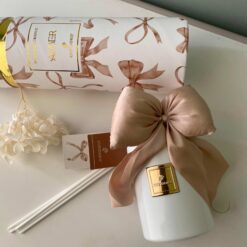 La parte superiore è completata da una bocchetta decorativa pensata per accogliere i bastoncini diffusori, che permettono una diffusione graduale e costante della fragranza. Il profumatore è impreziosito da un morbido fiocco in tessuto color moka mousse, applicabile grazie a un piccolo elastico, per un effetto caldo, elegante e sofisticato.