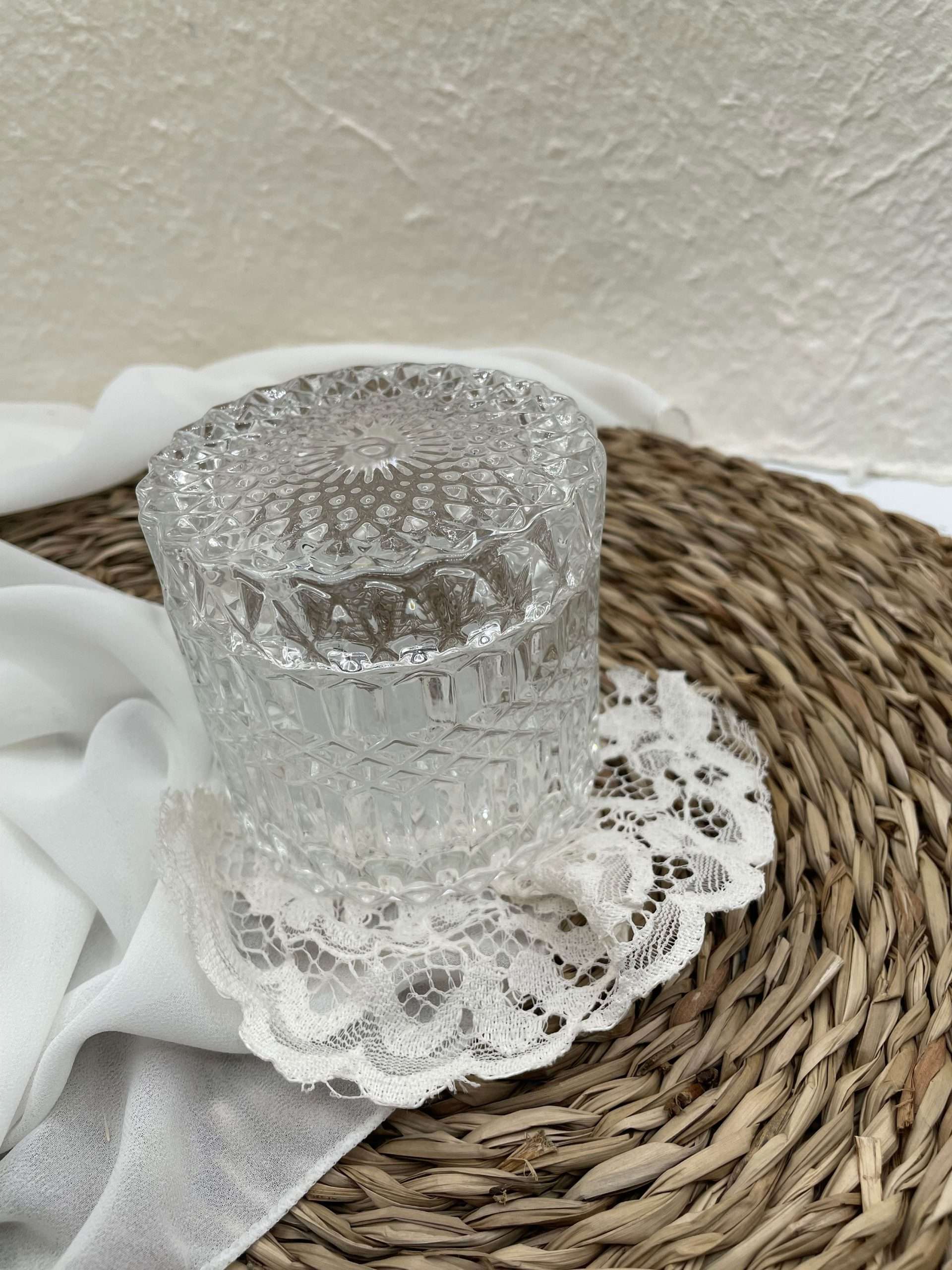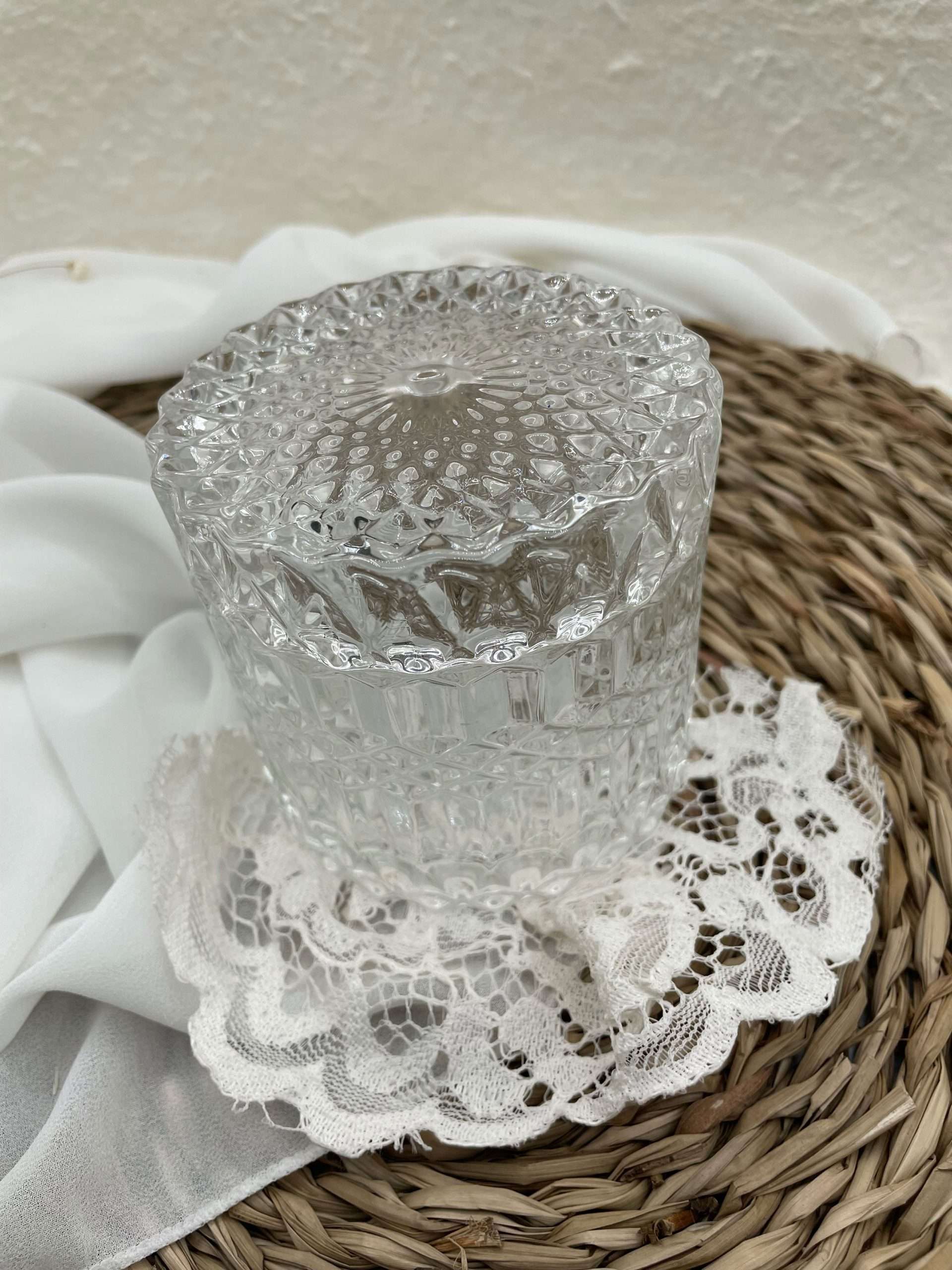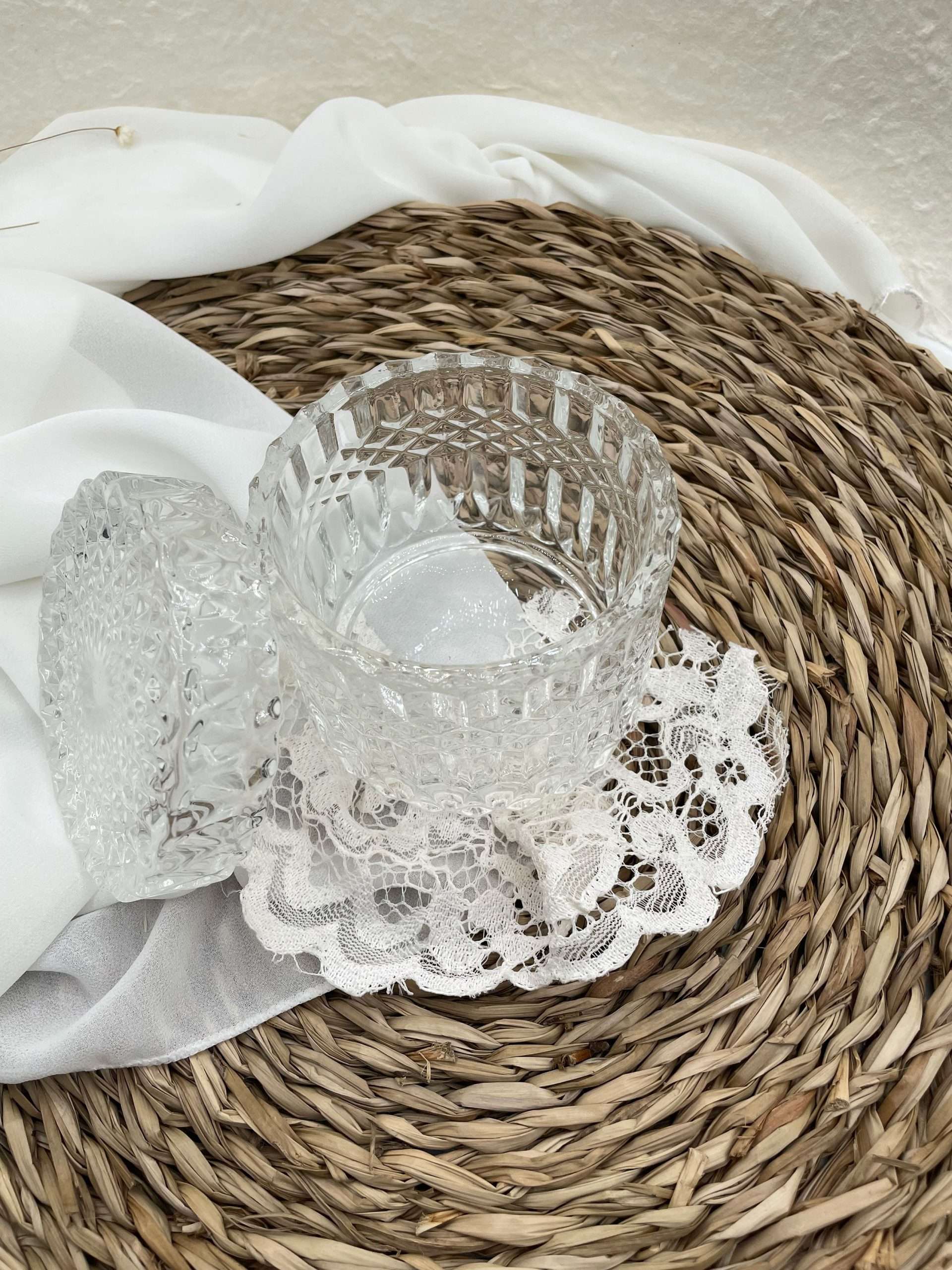 Scatolina tonda in vetro lavorato, con coperchio. .