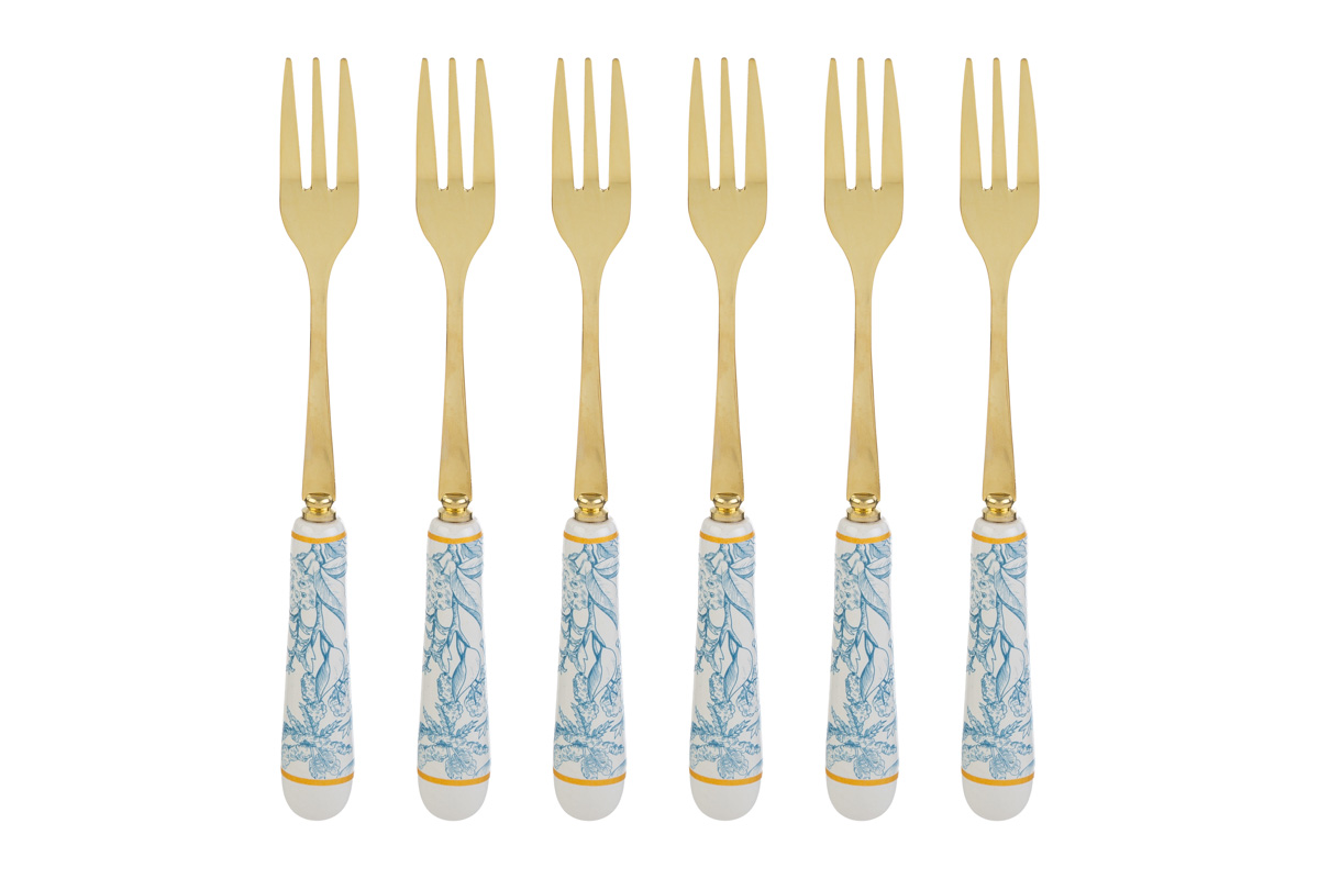 Delicato e raffinato, questo set composto da sei forchettine in metallo si distingue per gli eleganti manici decorati con motivo floreale celeste, capaci di donare alla tavola un tocco luminoso e armonioso. Un insieme pensato per impreziosire con discrezione la mise en place, valorizzando ogni dettaglio con sobria eleganza.