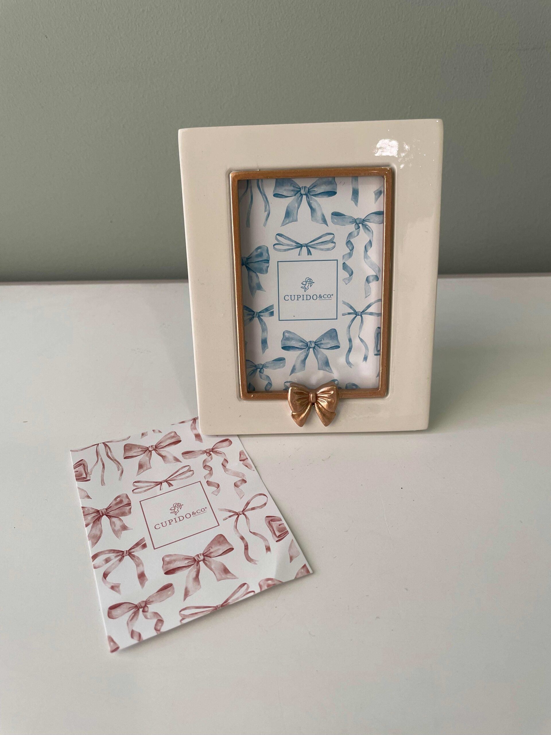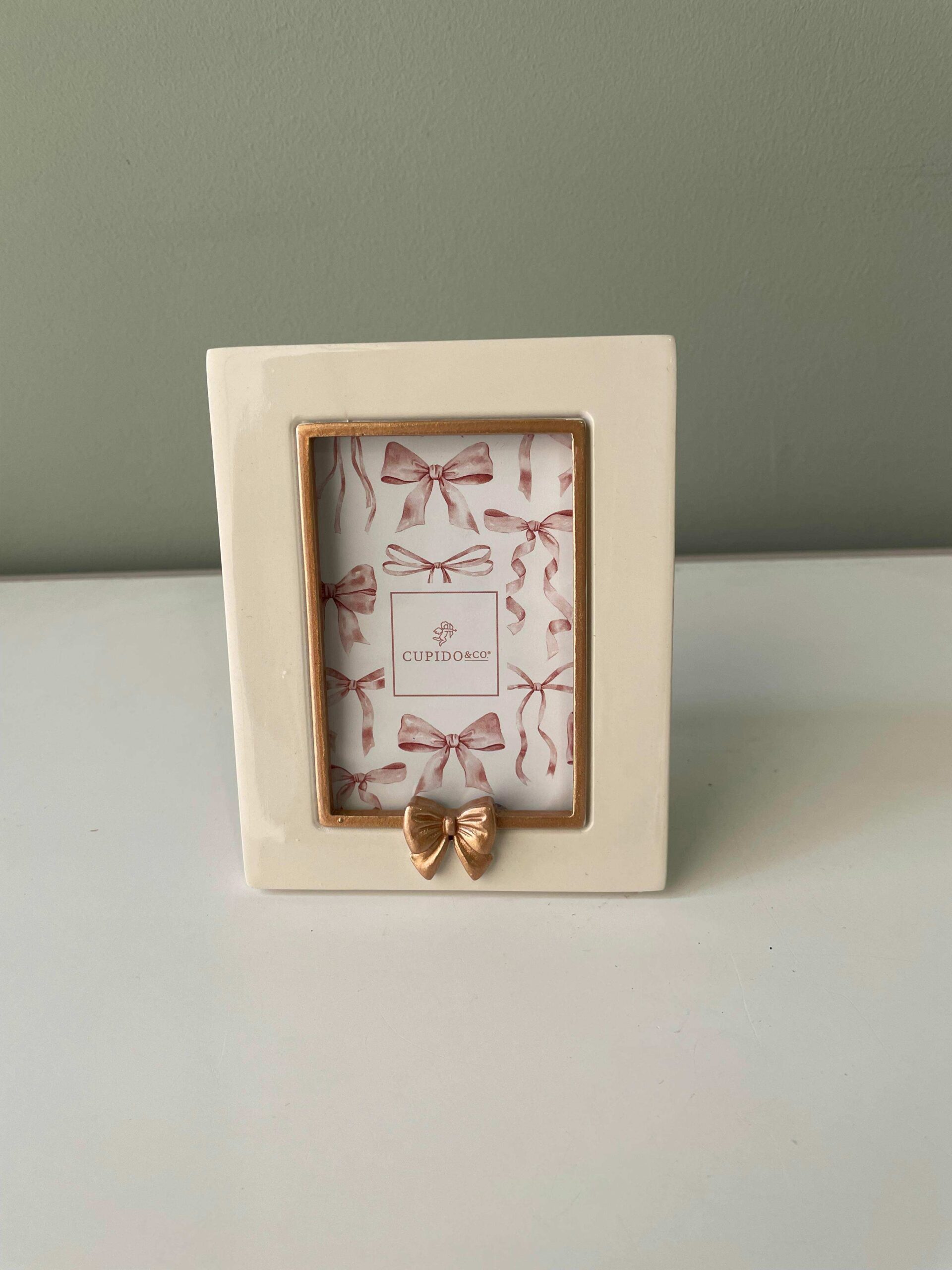 Portafoto decorativo in resina color avorio, appartenente alla delicata Linea Fiocchi di Cupido&Co., pensato per custodire i ricordi più preziosi con uno stile raffinato e senza tempo.