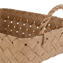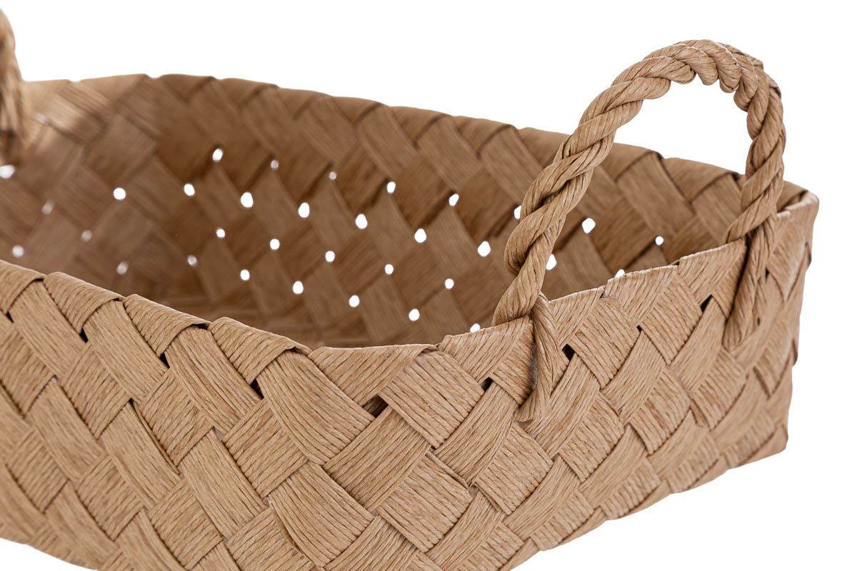 La forma rettangolare con angoli morbidi e i pratici manici intrecciati conferiscono equilibrio tra estetica e funzionalità . L’intreccio regolare crea un effetto visivo leggero e arioso, ideale per ambienti eleganti e coordinati.
