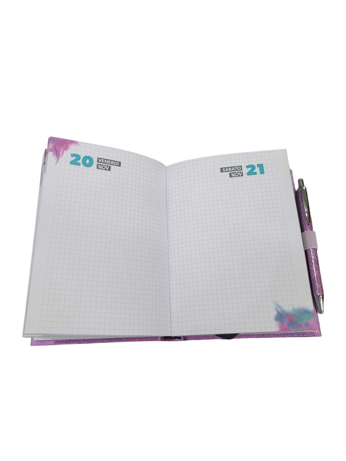 Inclusa nel diario trovi anche una penna coordinata con fusto glitterato, inserita in un pratico elastico portapenna, sempre pronta all’uso.