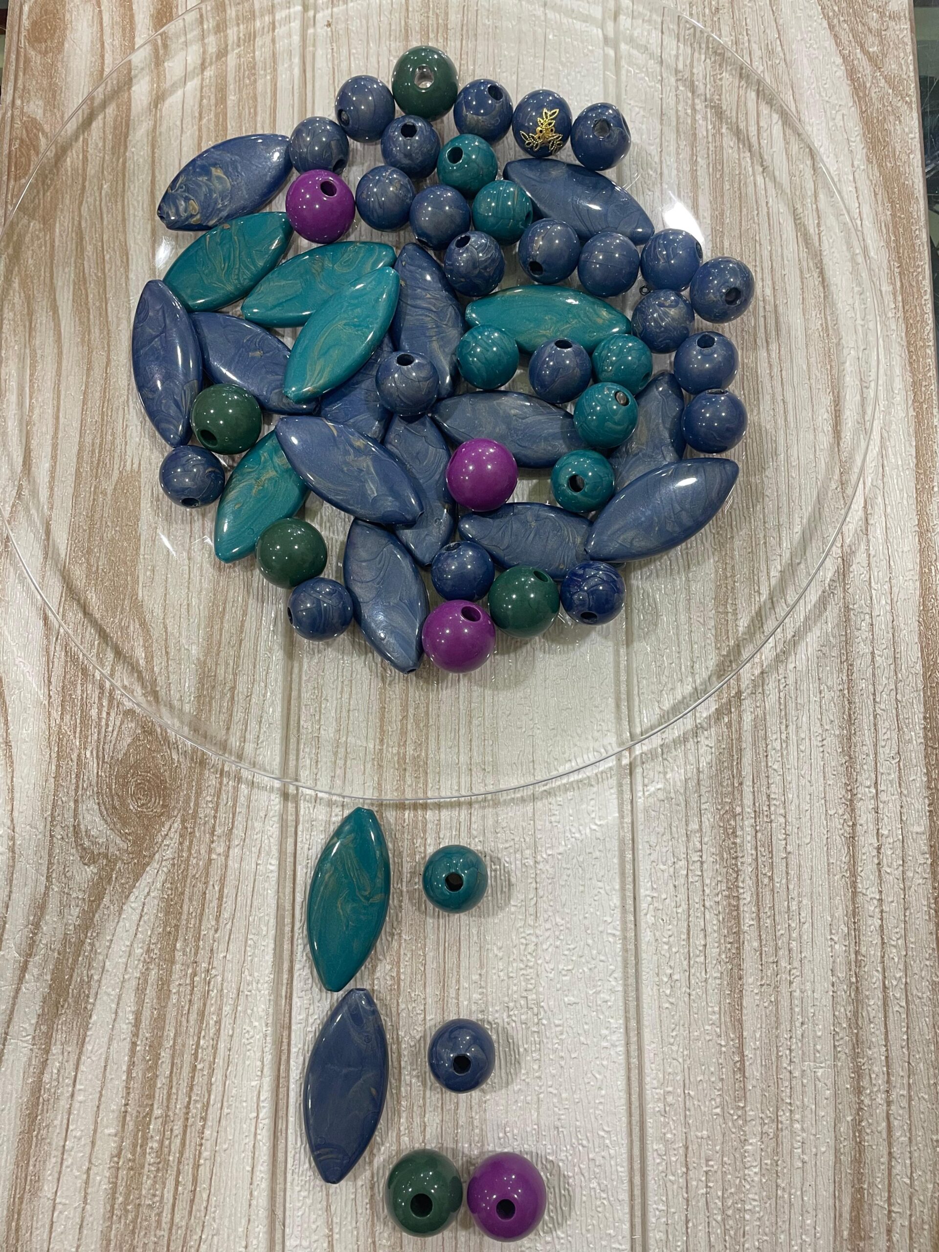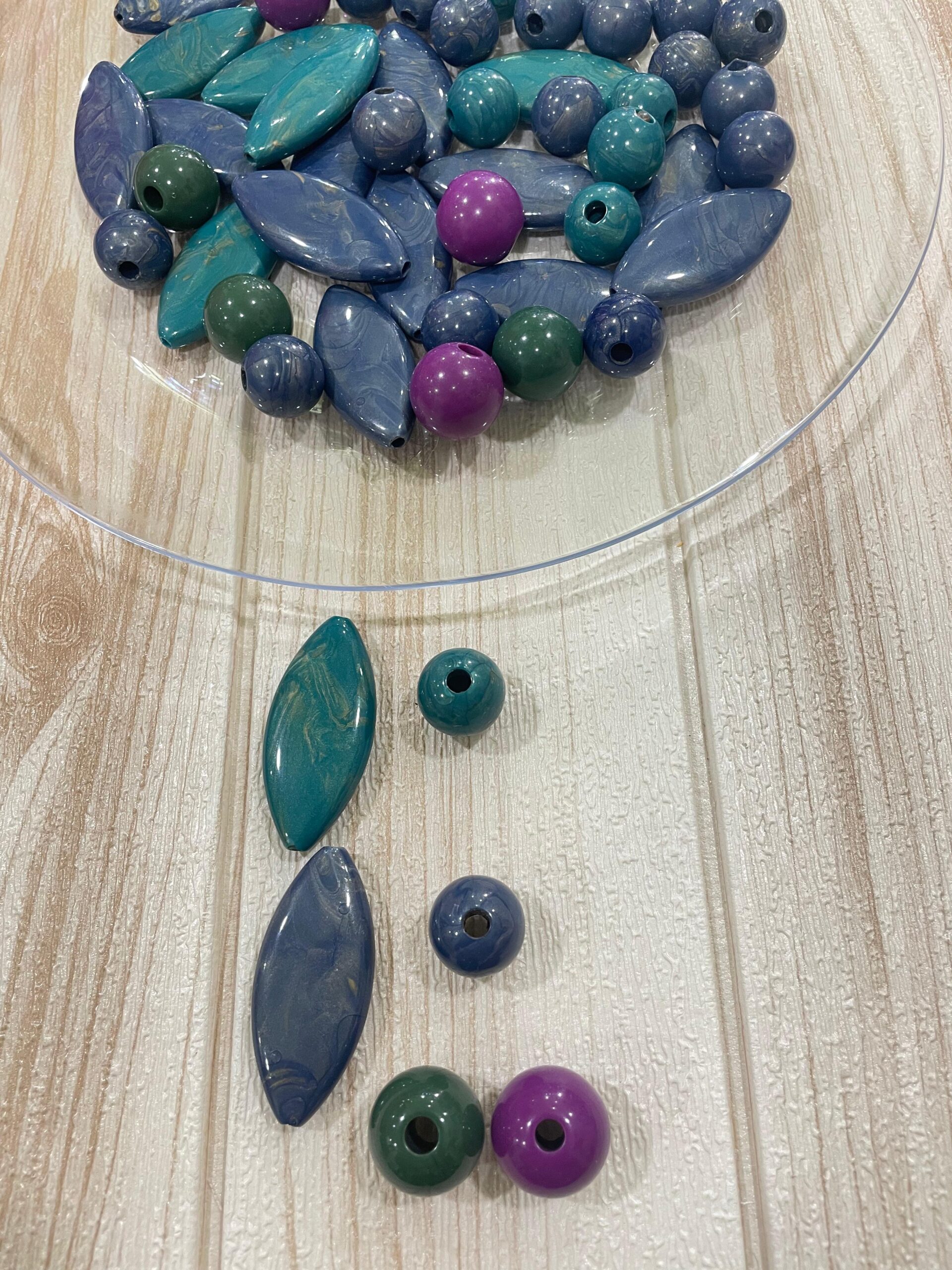 Elegante mix di perle in resina caratterizzato da raffinate tonalità fredde e profonde: blu polvere, petrolio, verde bosco, turchese, con delicati accenti viola.