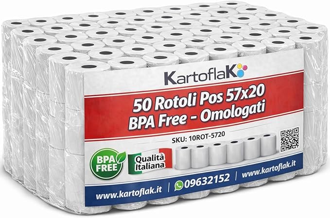 🧾 Kartoflak – Rotoli Termici POS 57 mm x 20 metri (50 Rotoli) | Carta Termica BPA Free Omologata
